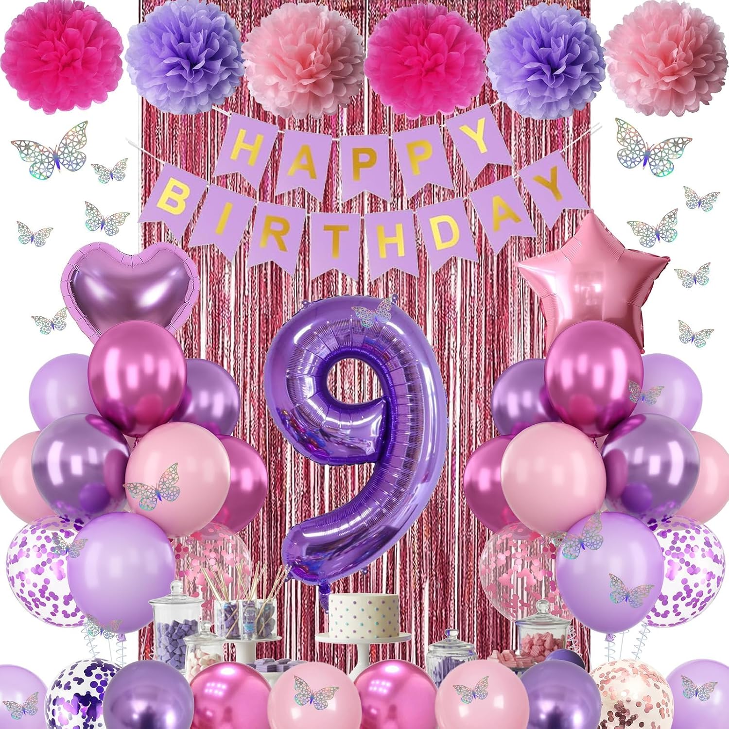 • PACKAGE INCLUDES: 1pc purple number 9 balloon, 1pc happy birthday banner, 2pcs light pink paper pom poms, 2pcs light purple paper pom poms, 2pcs hot pink paper pom poms, 1pc light pink fringe curtain, 1pc light pink star foil balloons, 1pc light purple heart foil balloons, 6pcs pastel purple balloons, 6pcs pastel pink balloons, 4pcs metallic purple balloons, 4pcs metallic magenta balloons, 3pcs purple confetti ballons, 3pcs pink confetti ballons, 1pc butterfly stickers set, 1pc ribbon