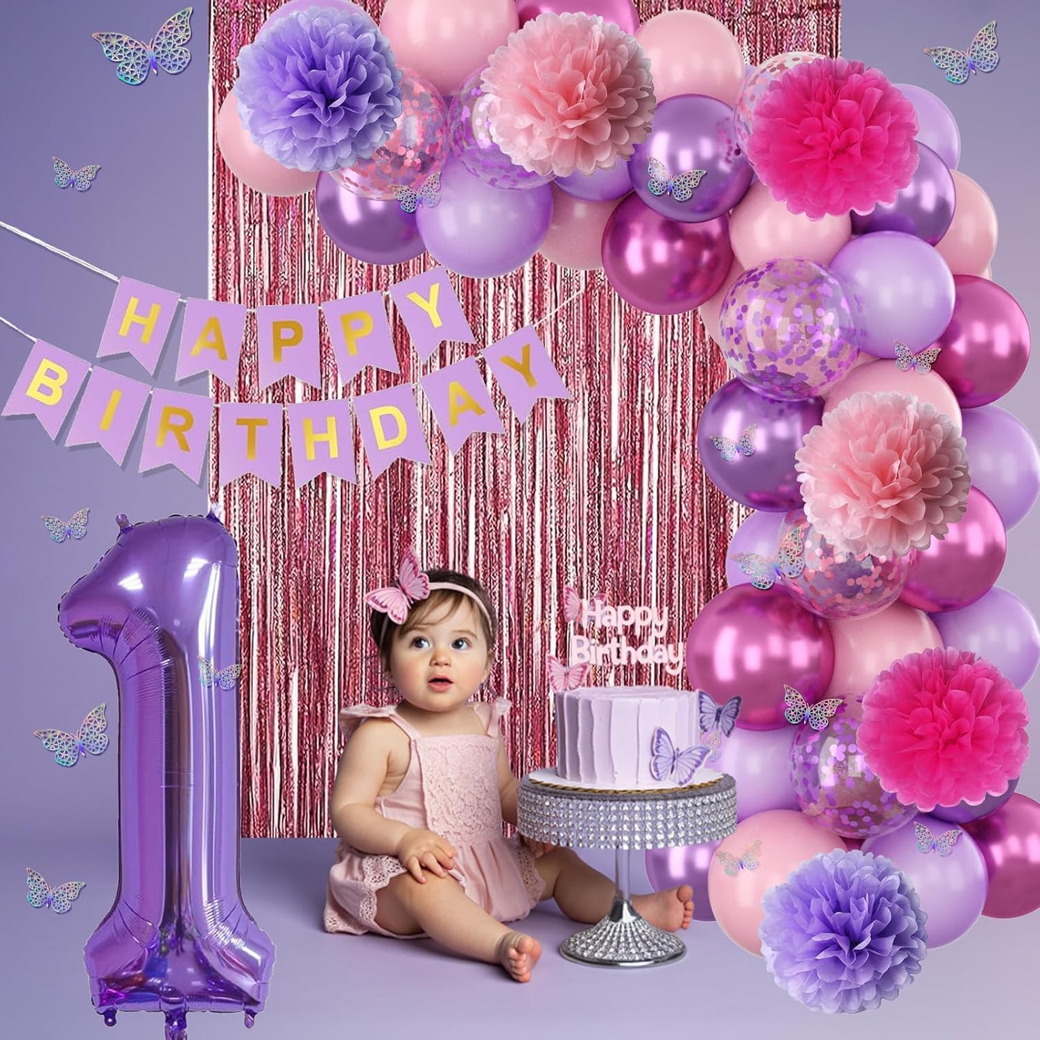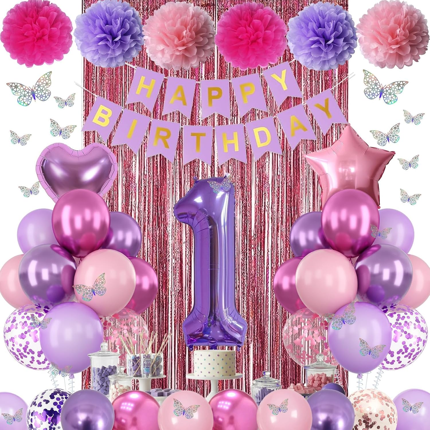 • PACKAGE INCLUDES: 1pc purple number 1 balloon, 1pc happy birthday banner, 2pcs light pink paper pom poms, 2pcs light purple paper pom poms, 2pcs hot pink paper pom poms, 1pc light pink fringe curtain, 1pc light pink star foil balloons, 1pc light purple heart foil balloons, 6pcs pastel purple balloons, 6pcs pastel pink balloons, 4pcs metallic purple balloons, 4pcs metallic magenta balloons, 3pcs purple confetti ballons, 3pcs pink confetti ballons, 1pc butterfly stickers set, 1pc ribbon