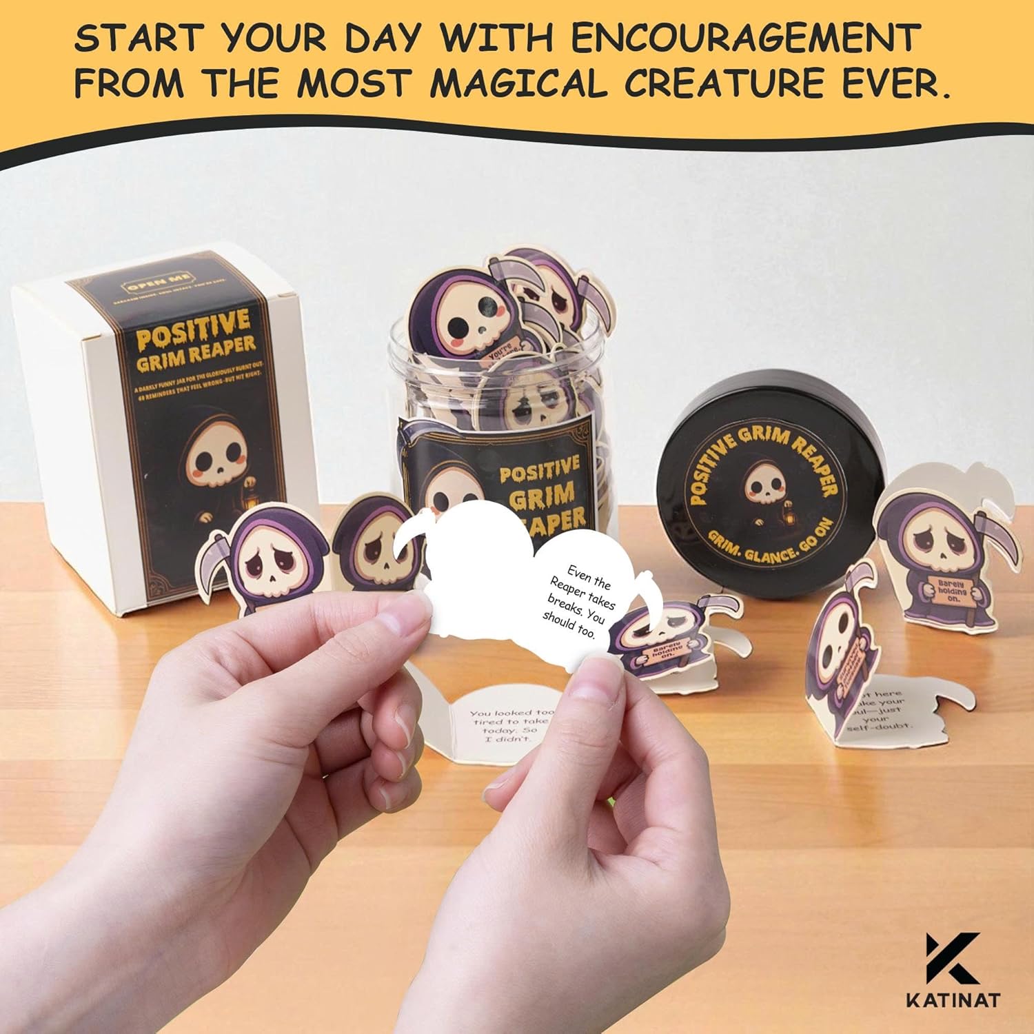 • πŸ’€ Positive Grim Reaper Jar – Emotional Support Grim Reaper: A chillingly fun addition to halloween basket stuffers and unforgettable centerpiece in any halloween gift basket.