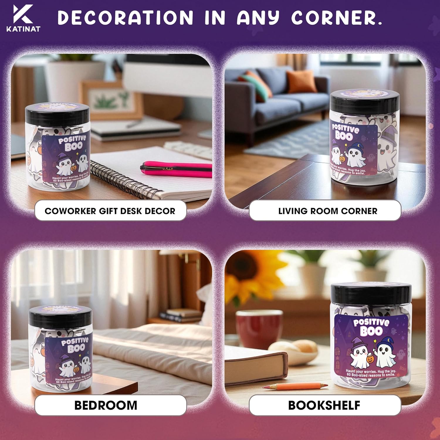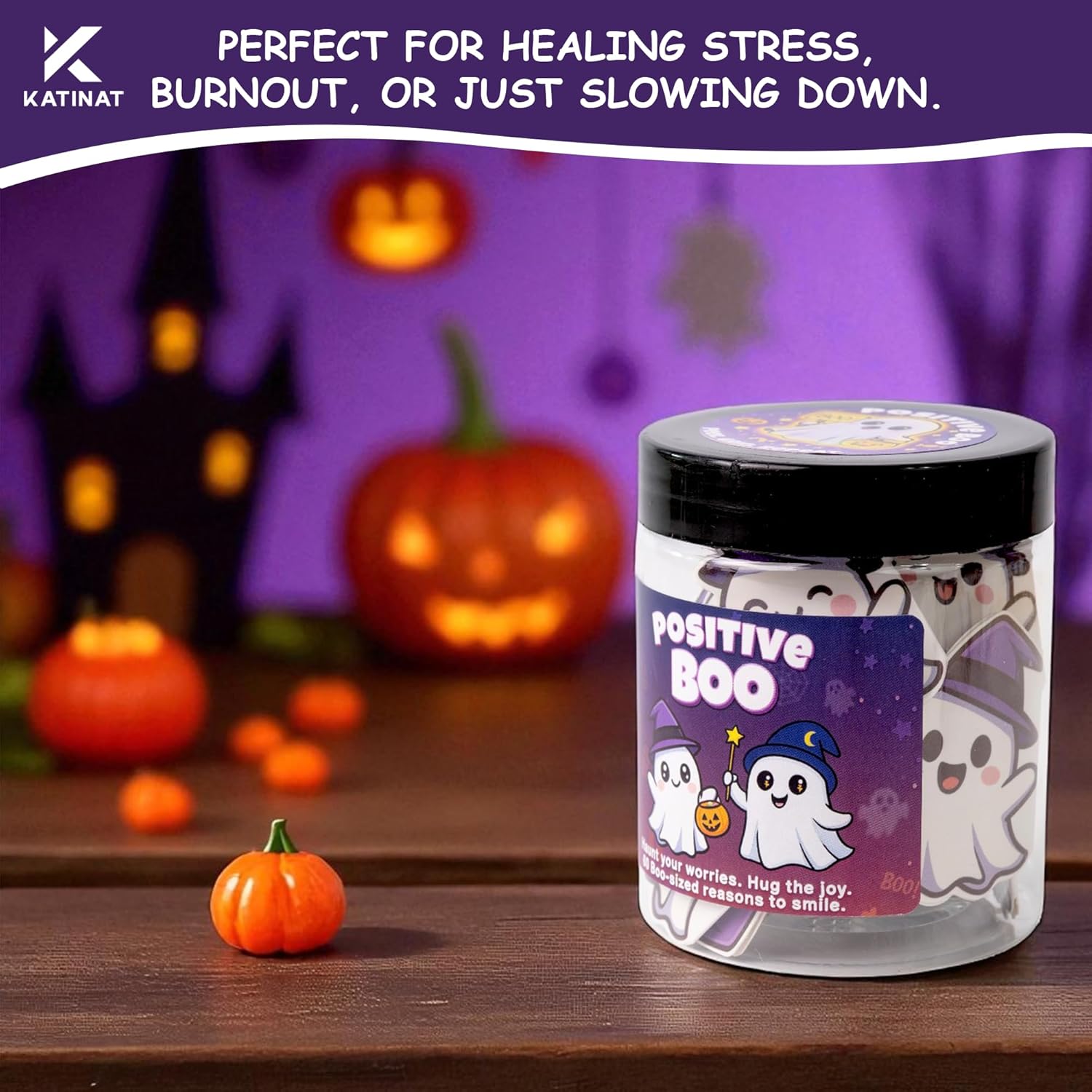 • πŸ‘» Positive Boo Jar – Emotional Support Ghost: A creative Halloween Jar with 60 ghost-shaped affirmation cards, perfect for boo basket stuffers and halloween boo basket stuffers.