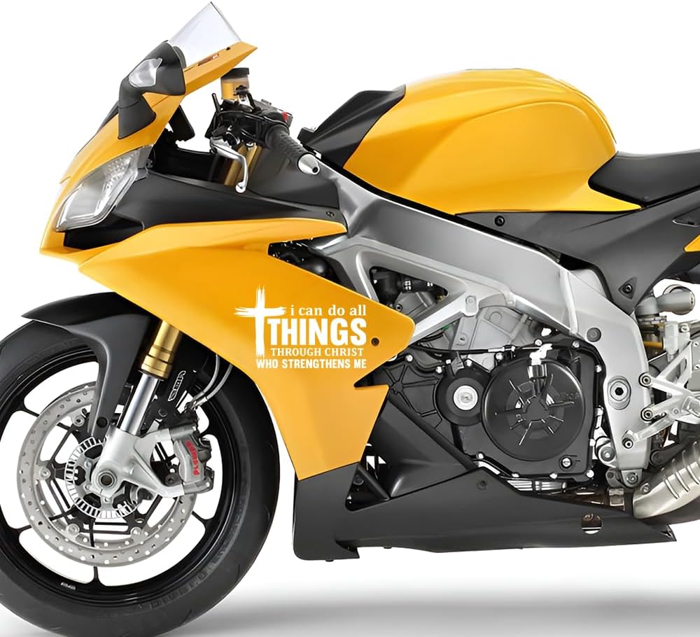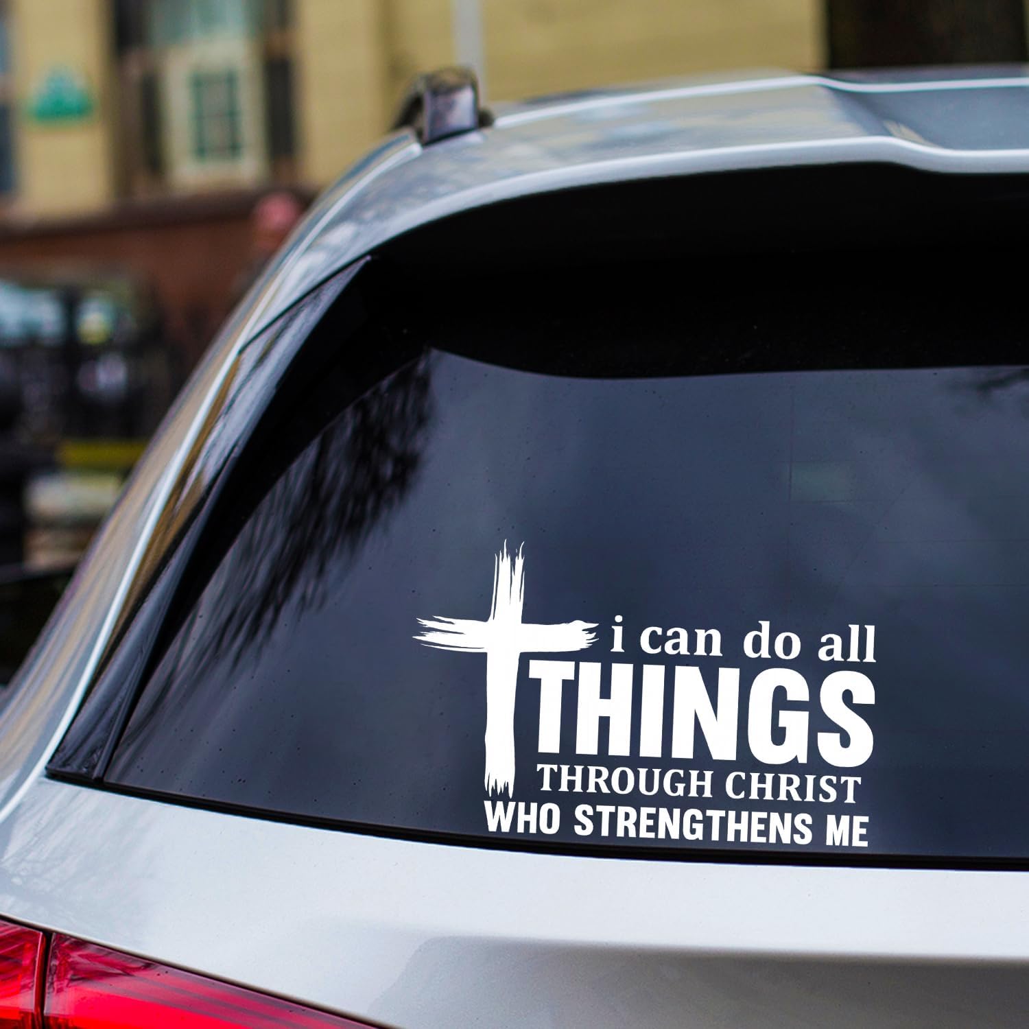 • Bible Verse Faith Sticker: Features Philippians 4:13 – “I can do all things through Christ who strengthens me” – in bold white vinyl. A timeless reminder of strength and faith for believers of all ages.