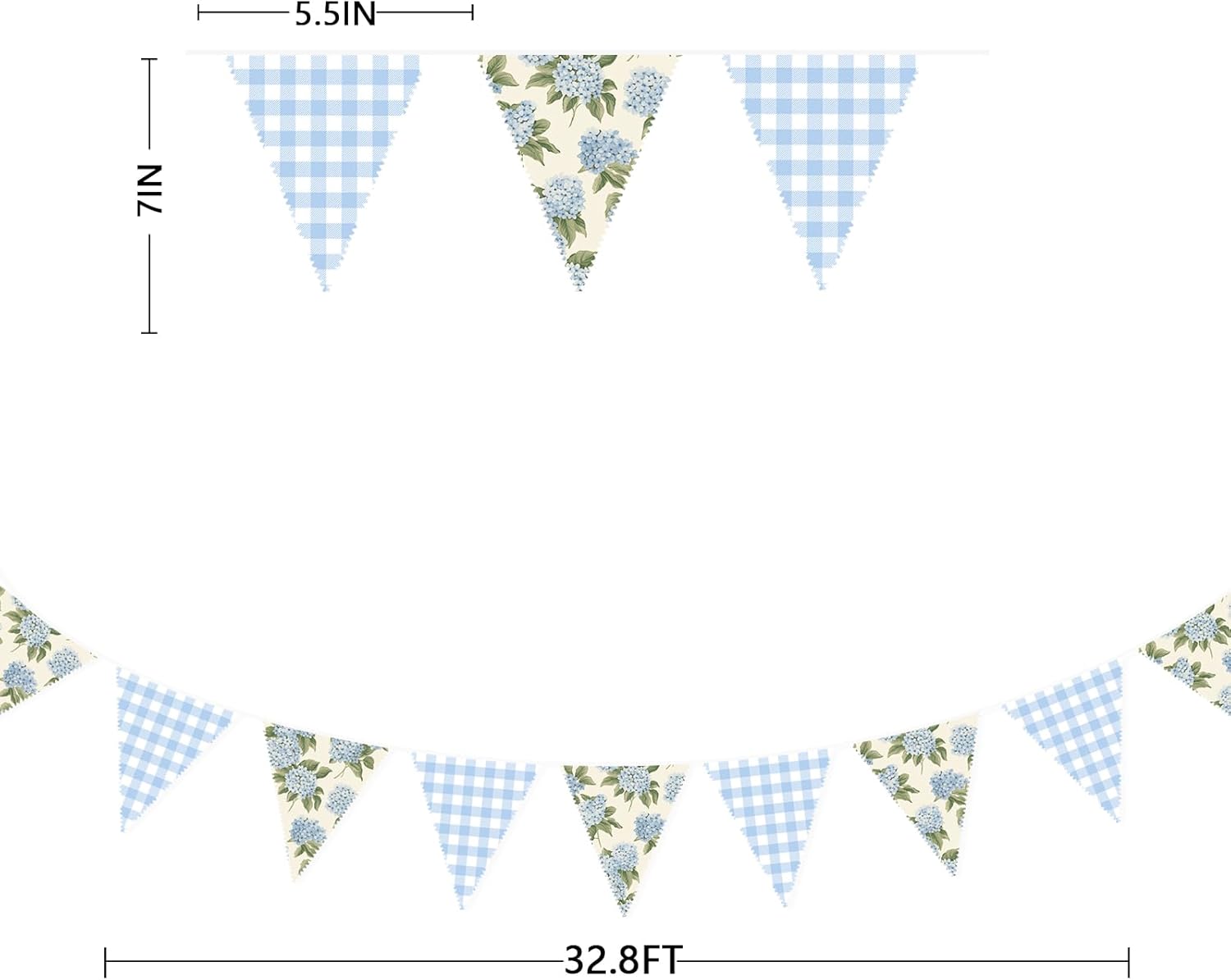 32Ft Blue Flora Party Decorations Blue Gingham HydrangeaTriangle Flag Fabric Banner Pennant Garland Streamer for Flora Birthday Vintage Flower Baby Shower Wedding Tea Party Garden Decor Supplies