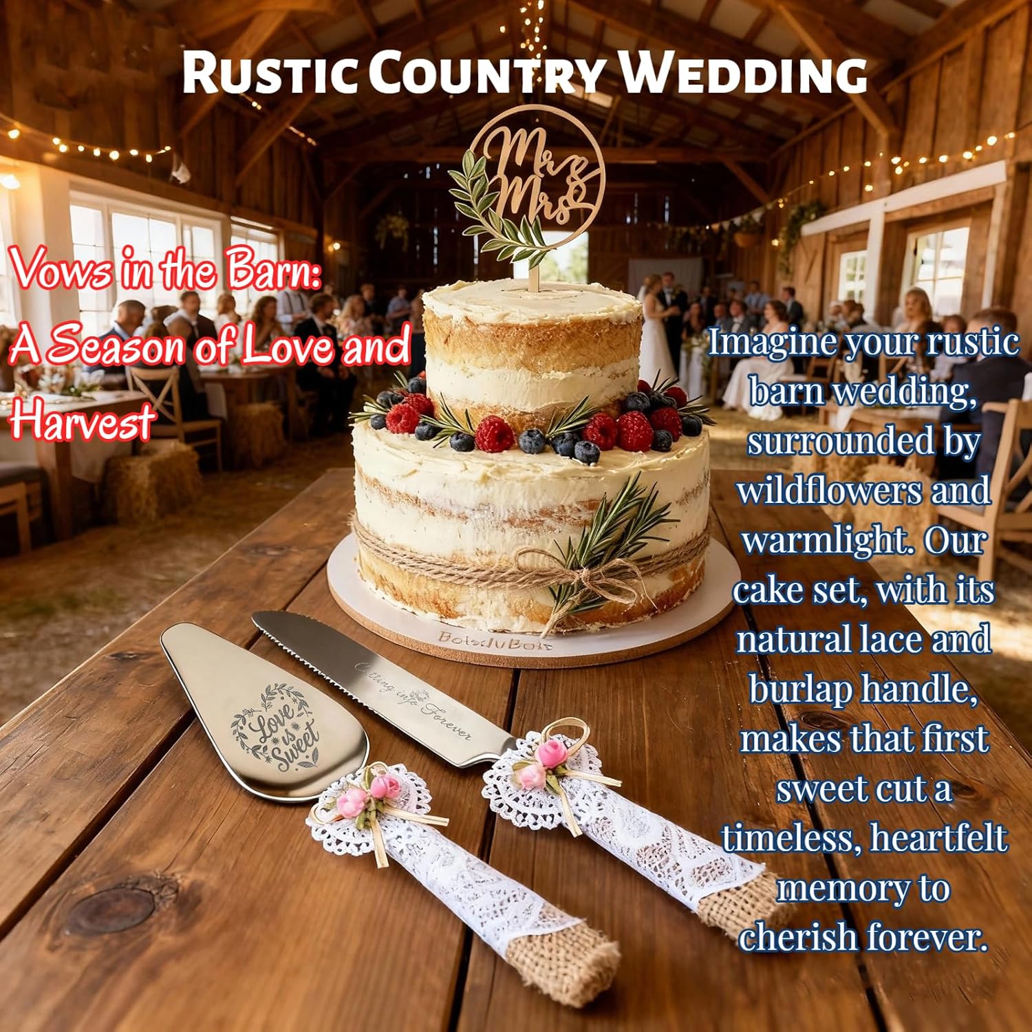 • Rustic Lace & Burlap Handles – Vintage-inspired design with lace, burlap, and ribbon flowers. Perfect for rustic, boho, or country weddings, adding timeless romance to your cake table.