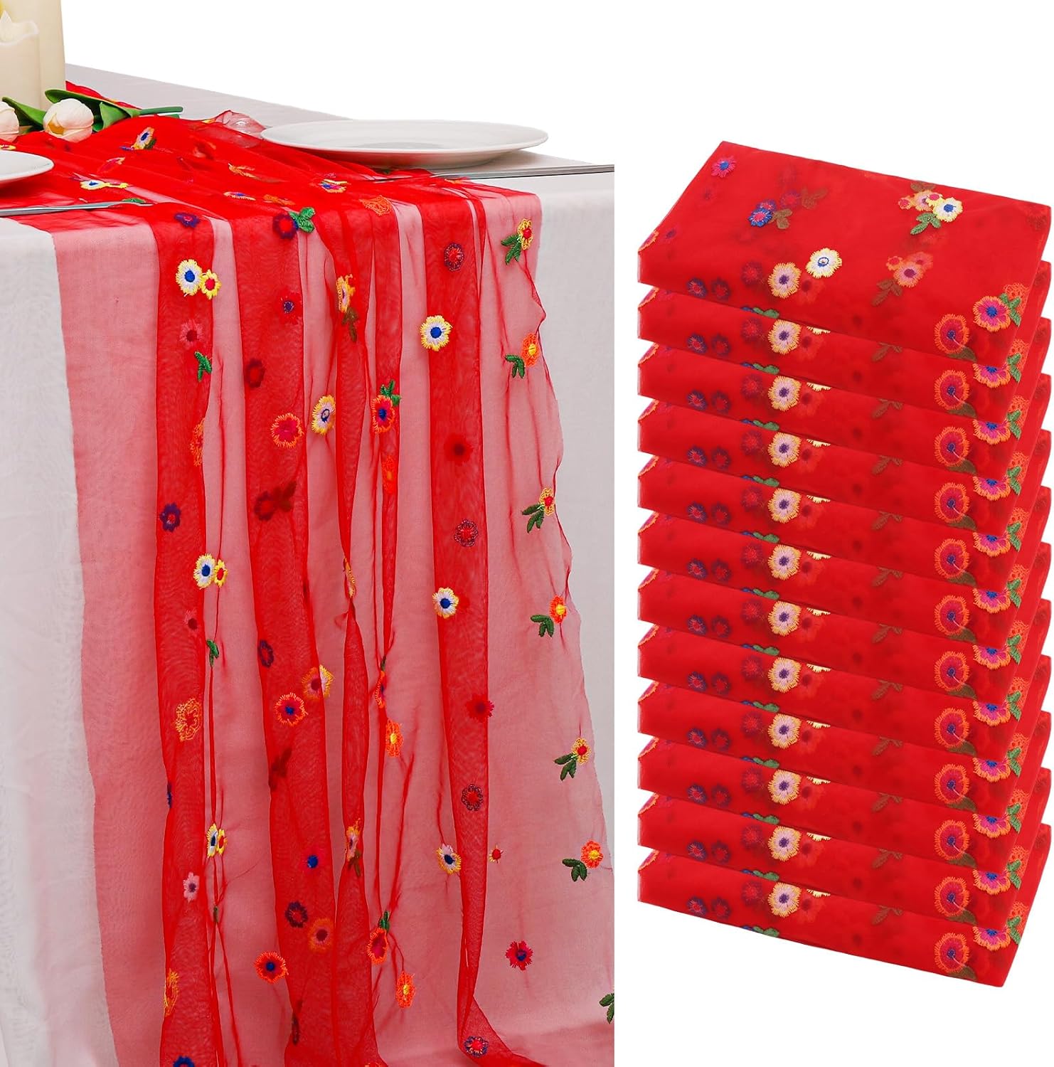 BINBE 12pcs Daisy Fall Table Runner Embroidery Gauze 10FT Florals Seasonal Tulle Holiday Birthday Kitchen Dining Table Decor for Home Party Red