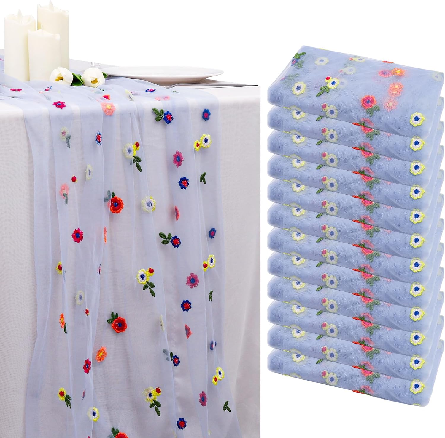 BINBE 12pcs Daisy Fall Table Runner Embroidery Gauze 10FT Florals Seasonal Tulle Holiday Birthday Kitchen Dining Table Decor for Home Party Blue