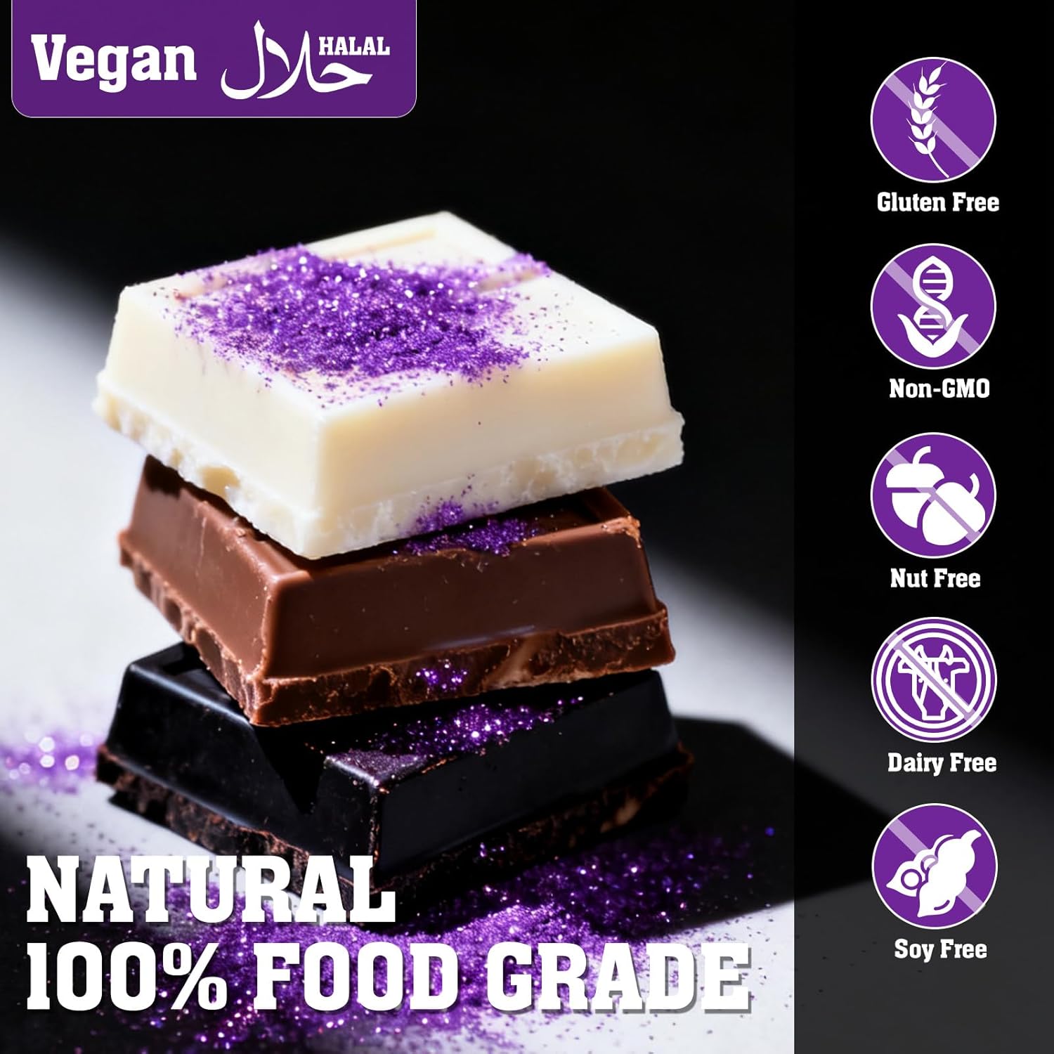 • 【Easy to Use & Versatile】: The edible glitter can simply apply dry with a brush, or mix with alcohol, lemon extract or oil-based flavorings for spray or brush application, or even mix into beverages. These edible luster dust is perfect for decorating frosting, fondant, whipped cream, cocktails, mocktails, champagne, and chocolates with a stunning purple shimmer effect.