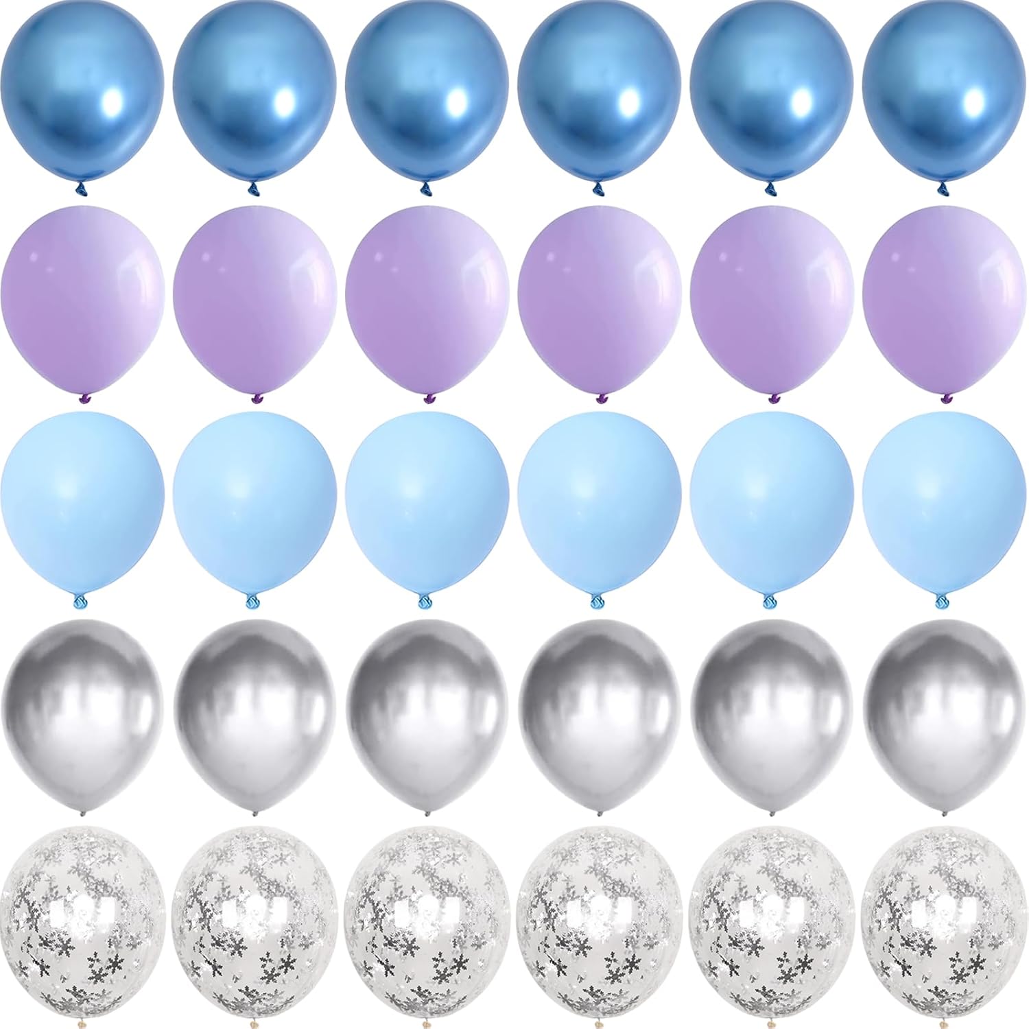 • Party Balloons Set: The winter wonderland balloons set have 60pcs 12inch helium balloons, include 15pcs light blue balloons, 15pcs pastel light purple lavender balloons, 10pcs chrome metallic silver balloons, 10pcs metallic chrome light blue balloons, 10pcs silver snow confetti balloons, and 2pcs white balloon ribbon.