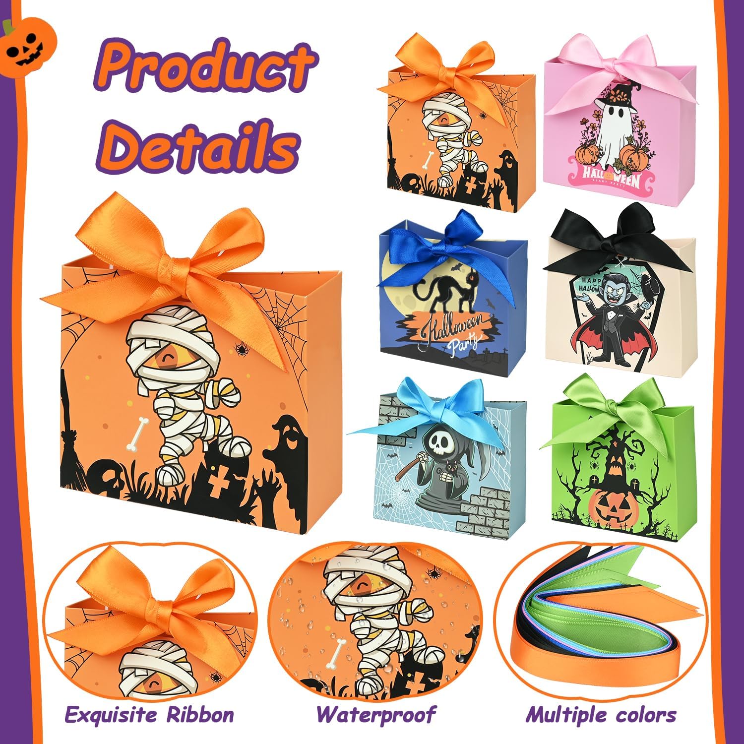 24PCS Halloween Goodies Bags, Trick or Treat Candy Gift Paper Bags Bulk with Ribbons, Halloween Treat Boxes for Kid, Party Favor, Classroom Exchange, Home Decoration 4.5 x 3.9 x 1.7 Inches
