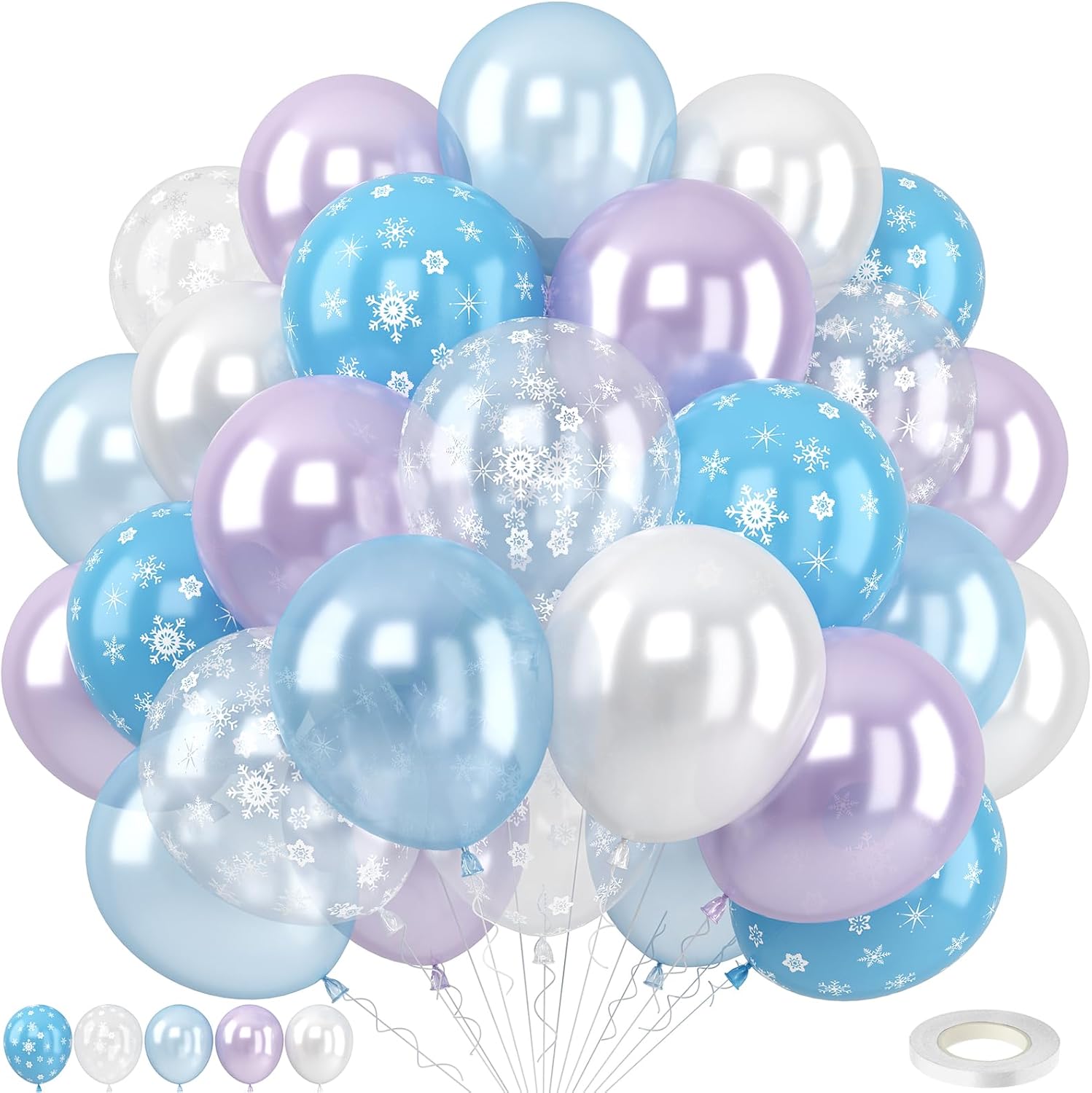 • 【Snow Balloons Set】This 12inch 50pcs winter iridescent balloons kit includes 15pcs pearl purple balloons, 10pcs pearl blue balloons, 15pcs pearl white balloons, 5pcs transparent snowflake balloons 5pcs blue snow balloons, and 1pc ribbon. A perfect choice for ice snow theme party and winter wonderland decorations.