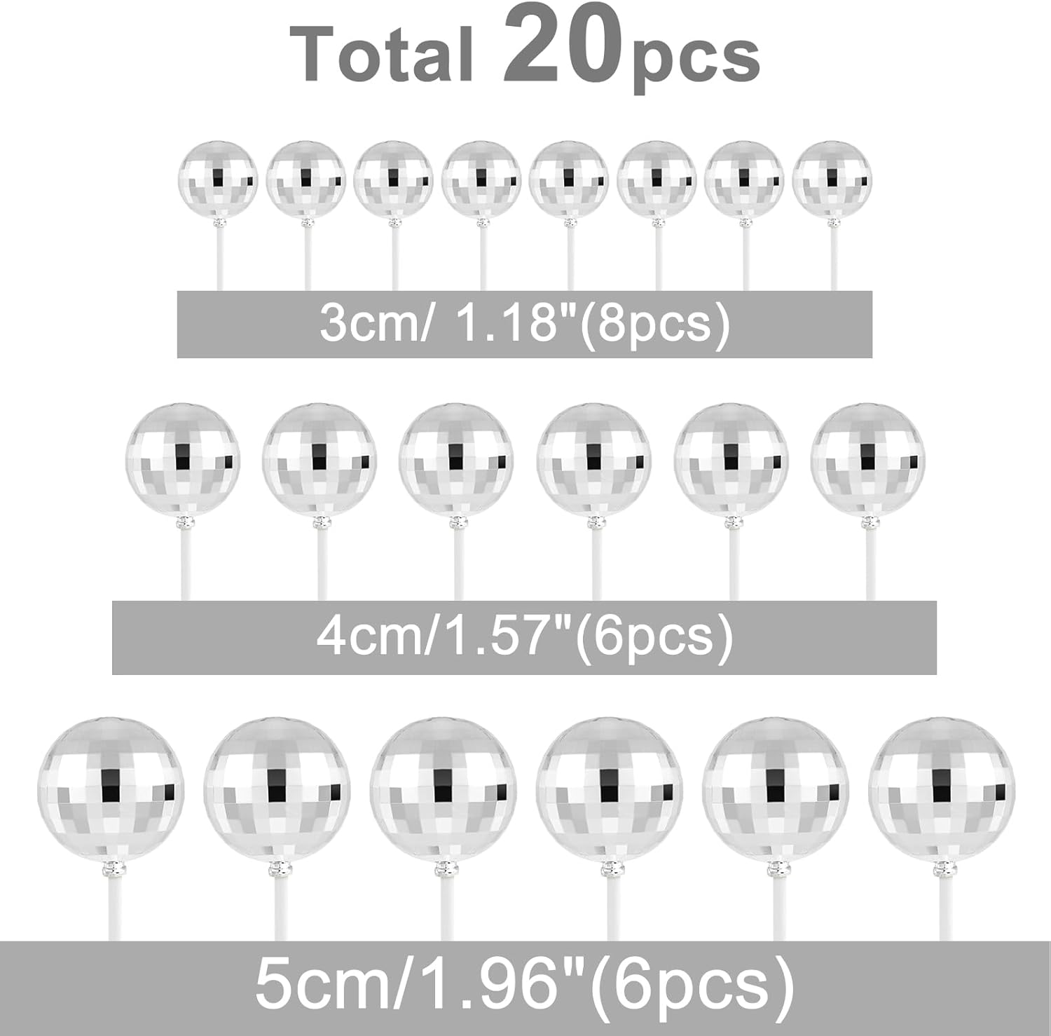 • Package includes: 20 pcs silver disco balls for cake decorations. there are 8 balls with a diameter of 1.18 inches/ 3 cm, 6 balls with a diameter of 1.57 inches/ 4 cm,6 balls with a diameter of 1.96 inches/ 5 cm.