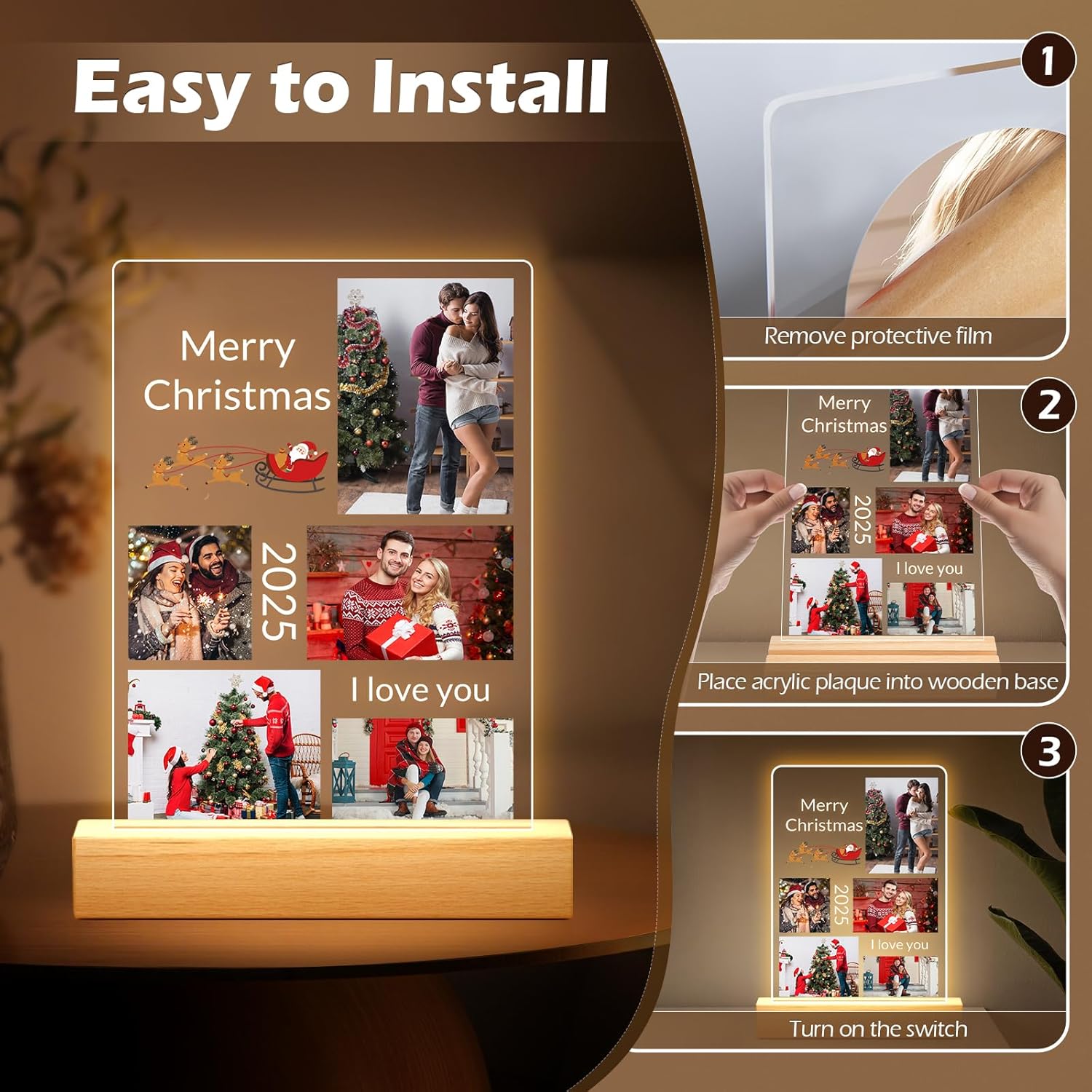 • Personalized Photo Frame with Night Light: Simply upload your favorite photos and add custom text to create a unique acrylic photo plaque with an integrated night light. This artistic display beautifully showcases your precious memories, adding a touch of romance and meaning to any space.