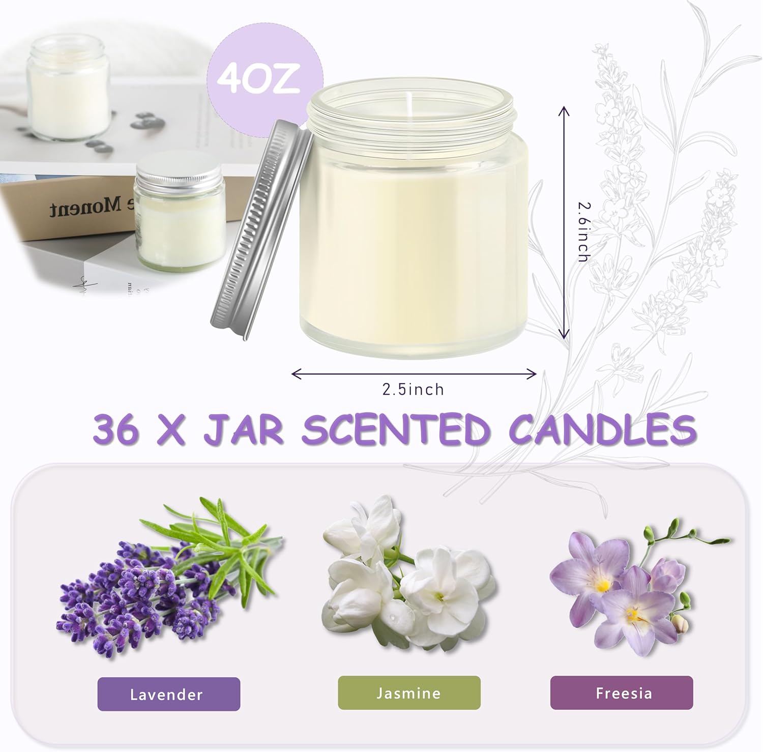 • Product Contents: 36 candles (4 oz each) in glass jars with silver lids, including 12 lavender, 12 freesia, and 12 jasmine-scented candles.