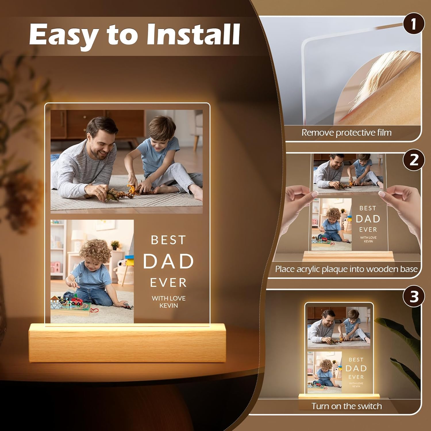 Custom Picture Frames with Photo, Personalized Photo Frame with Night Light, Customized Picture Frames, Custom Photo Gifts, Personalized Birthday Gifts for Dad, Baby, Kids, Family