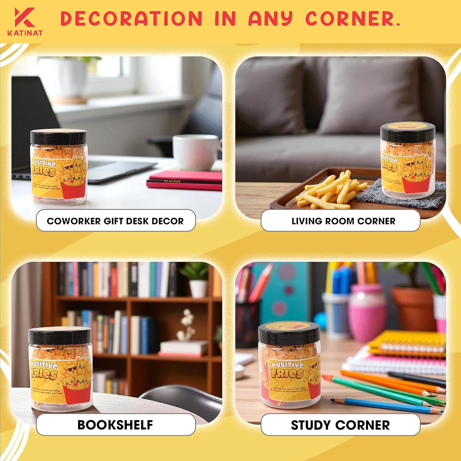 • ๐ŸŒญ 60 Fries-Shaped Affirmation Cards โ€“ This jar is packed with 60 hilarious and uplifting cards shaped like mini Fries! Each one delivers a bite-sized boost of encouragement to brighten your day.