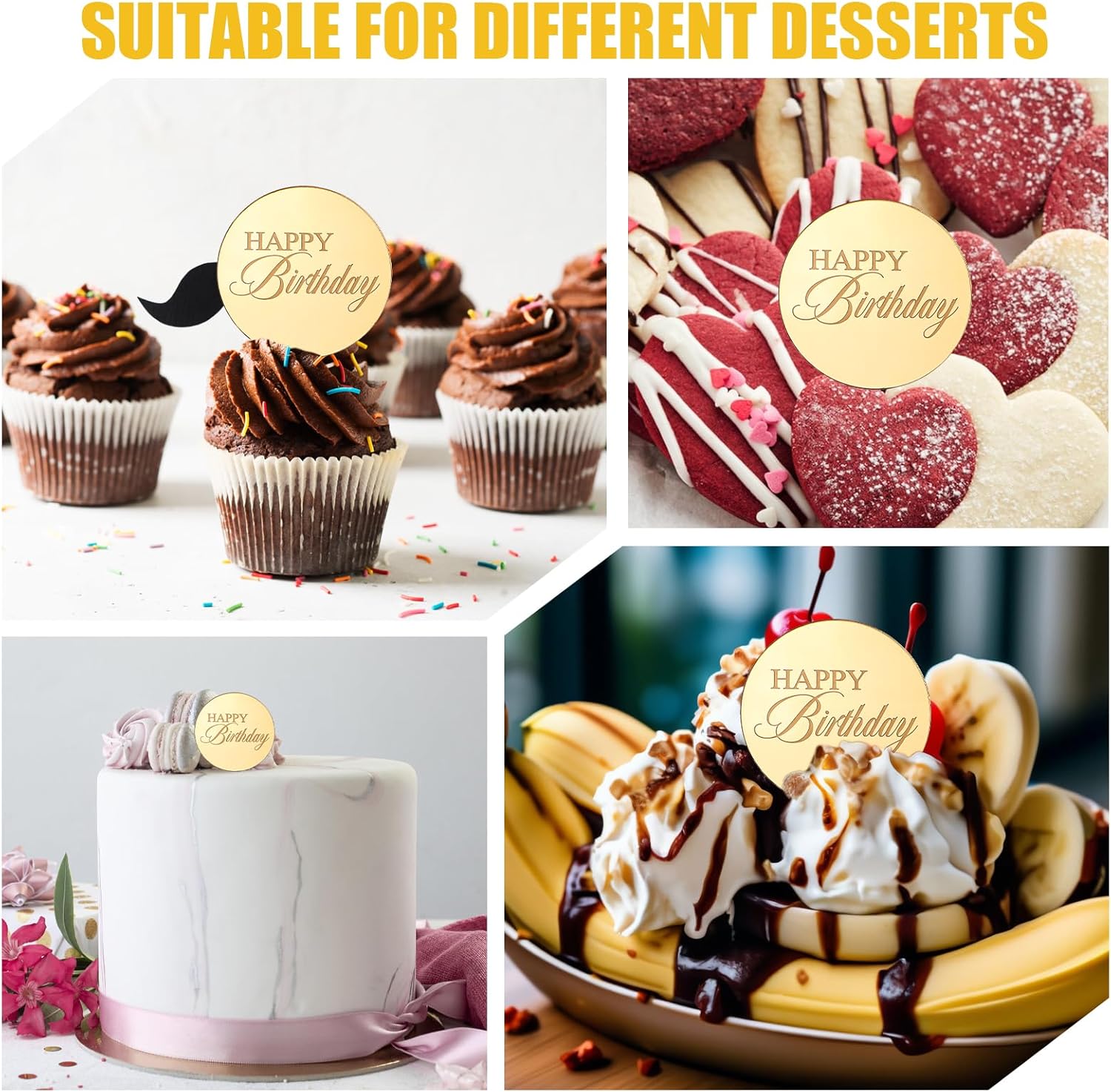 • 【Elegant Visual Enhancement】The gold mirror finish creates a reflective surface that elevates dessert presentations with modern sophistication. The engraved 'Happy Birthday' lettering appears clearly against the glossy background, making these cake decorations visually striking from all angles. This decorative effect transforms ordinary desserts into centerpiece attractions for special occasions