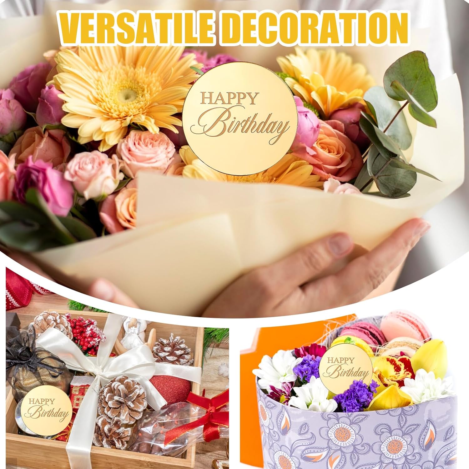 • 【Versatile Decoration Applications】These versatile cake decorations enhance various desserts including cupcakes, cookies, ice cream, and full-sized cakes. The round cake toppers also serve as elegant accents for gift boxes, DIY crafts, and table centerpieces. Their universal design complements different party themes and food presentations, providing multiple decorative options beyond traditional birthday celebrations