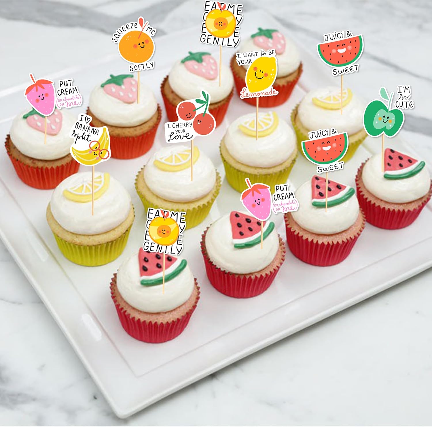 24pcs Tutti Fruity Fruit Cupcake Toppers - Tropical Summers Kids Happy Birthday Cake Toppers - Watermelon, Lemon, Strawberry, Cherry Cake Decorations for Baby Shower Party Decorations