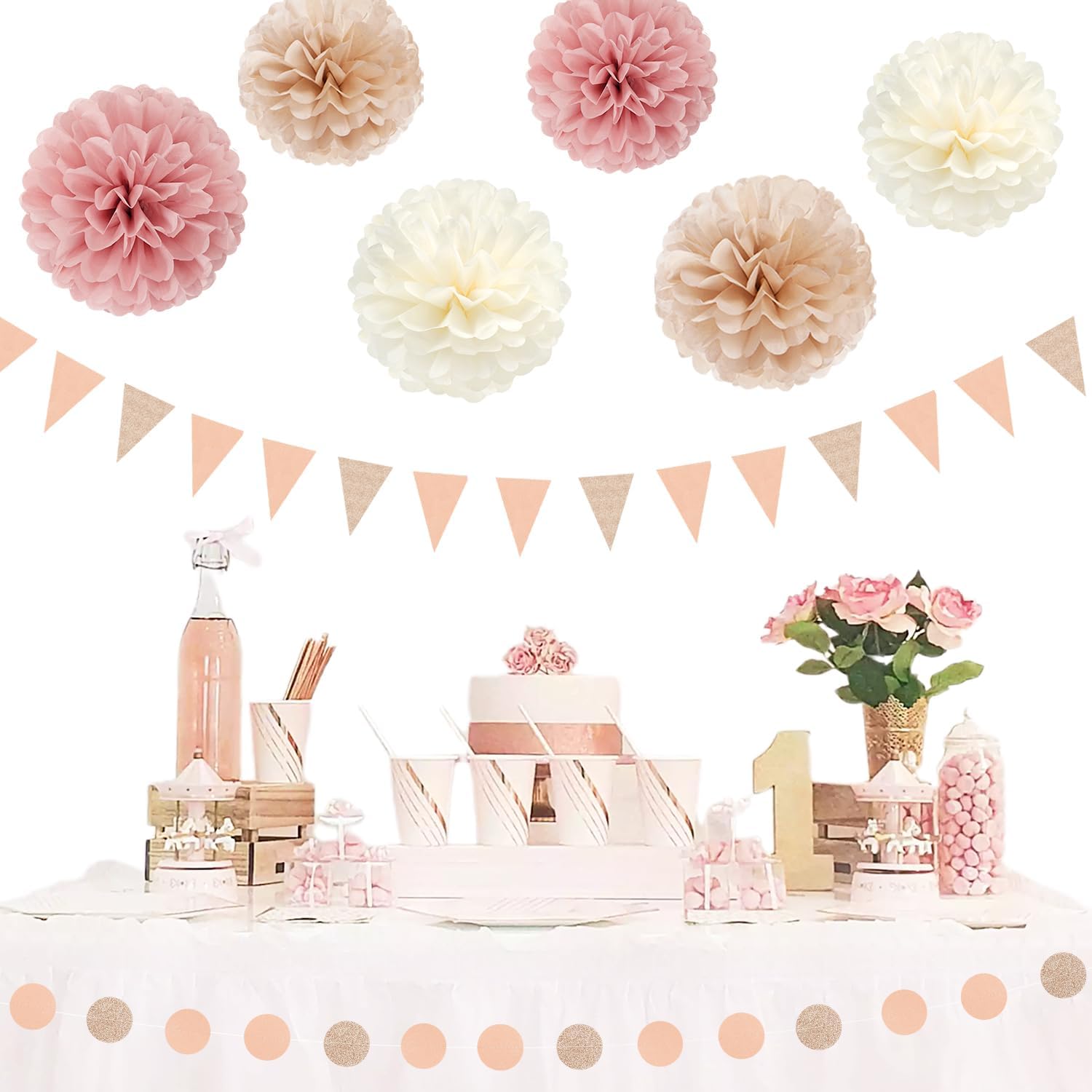 • 【Package Contains】The champagne beige pink peach rose gold party kits include 6pcs tissue paper flowers: 3pcs 8" and 3pcs 10" in three color, 1pcs Triangle Flags,1pcs circle dots paper garland,15pcs tassel garland. Total 23pcs.