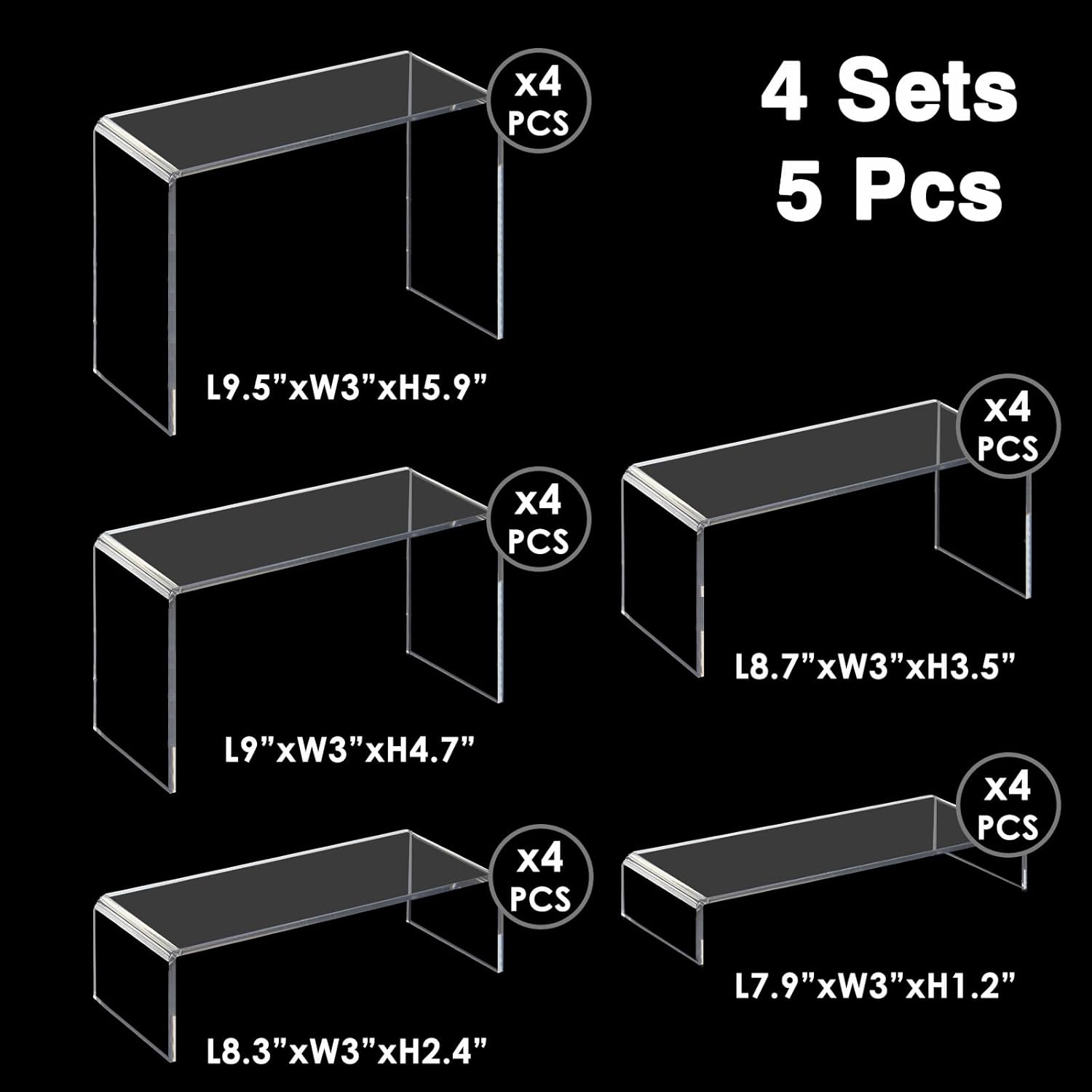 • 【Multiple Display Layers】With four different sizes (9.4x3x5.9in, 9x3x5in, 8.5x3x3.5in, 8.2x3x2.7in and 7.8x3x1.2in), each with 4-pieces, you'll have ample display layers to showcase your items.