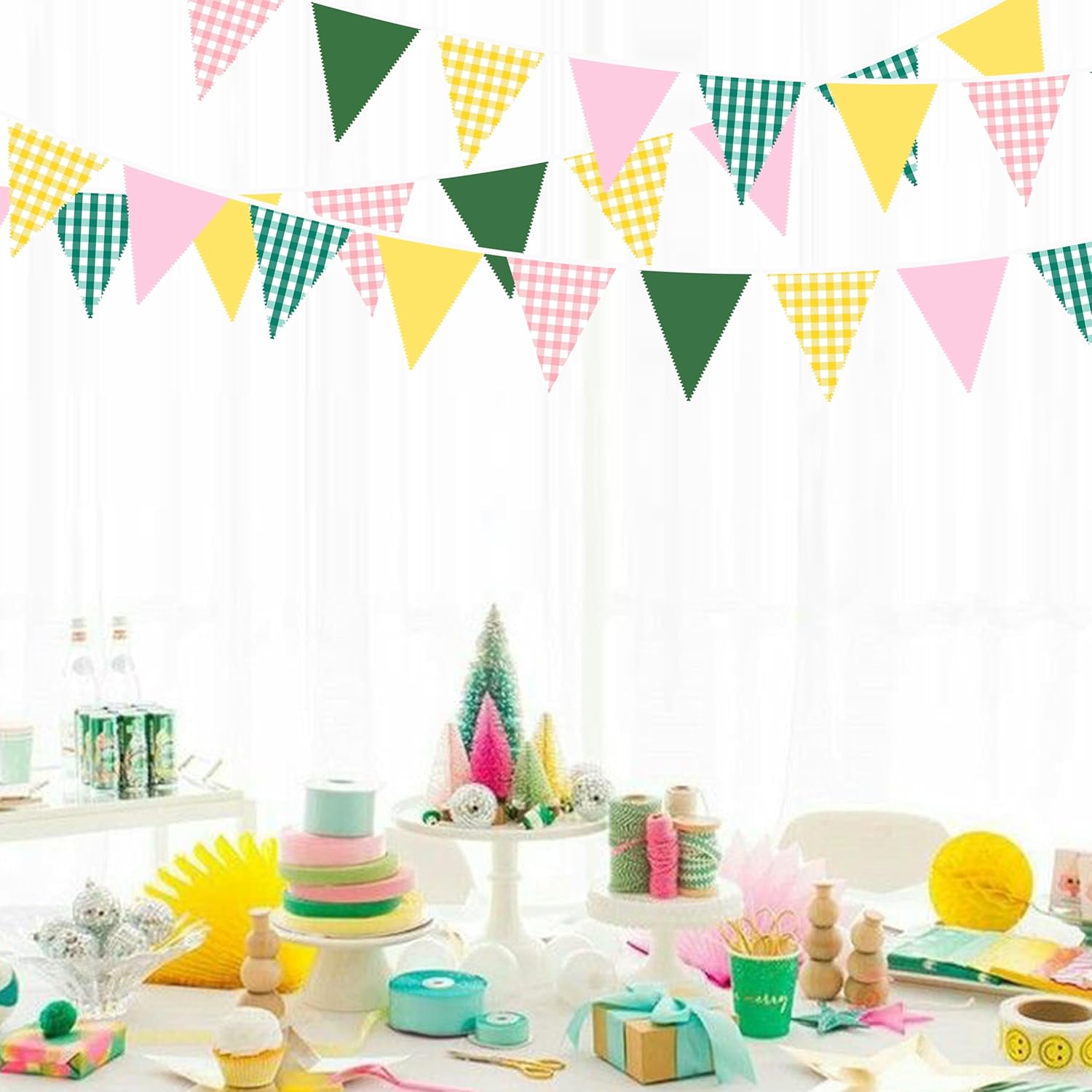 • Package Including:1 pack pink green and yellow buffalo plaid checkered fabric bunting banner garland in pink gingham, green gingham, yellow gingham and pink green yellow colors, with 36pcs flags in 10M/32.8Feet. Flag Size: 5.5in width x 7in height.