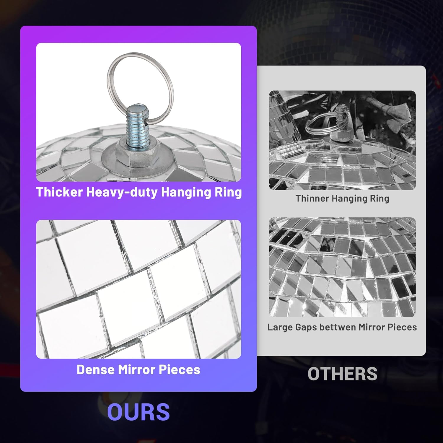 • Easy Installation - No assembly required, with a built-in hanging ring that easily attaches to a rotating motor, or place the mirror ball on the floor or anywhere you like for decoration