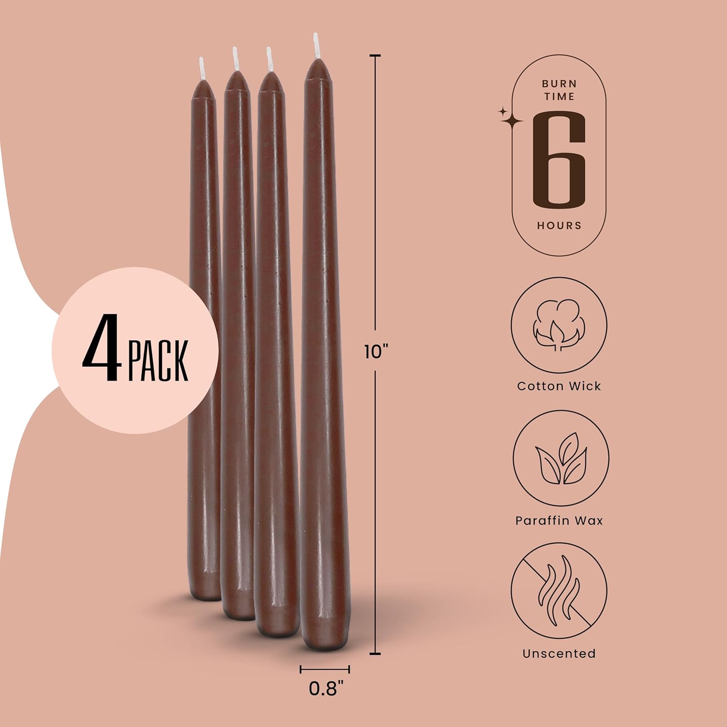 Leor & Lair Brown Taper Candles - 4 Pack 10" Brown Candlesticks - Unscented Long Burning Candle Sticks for Farmhouse Decor, Dinner Table, Holidays, Weddings, Restaurants & Events