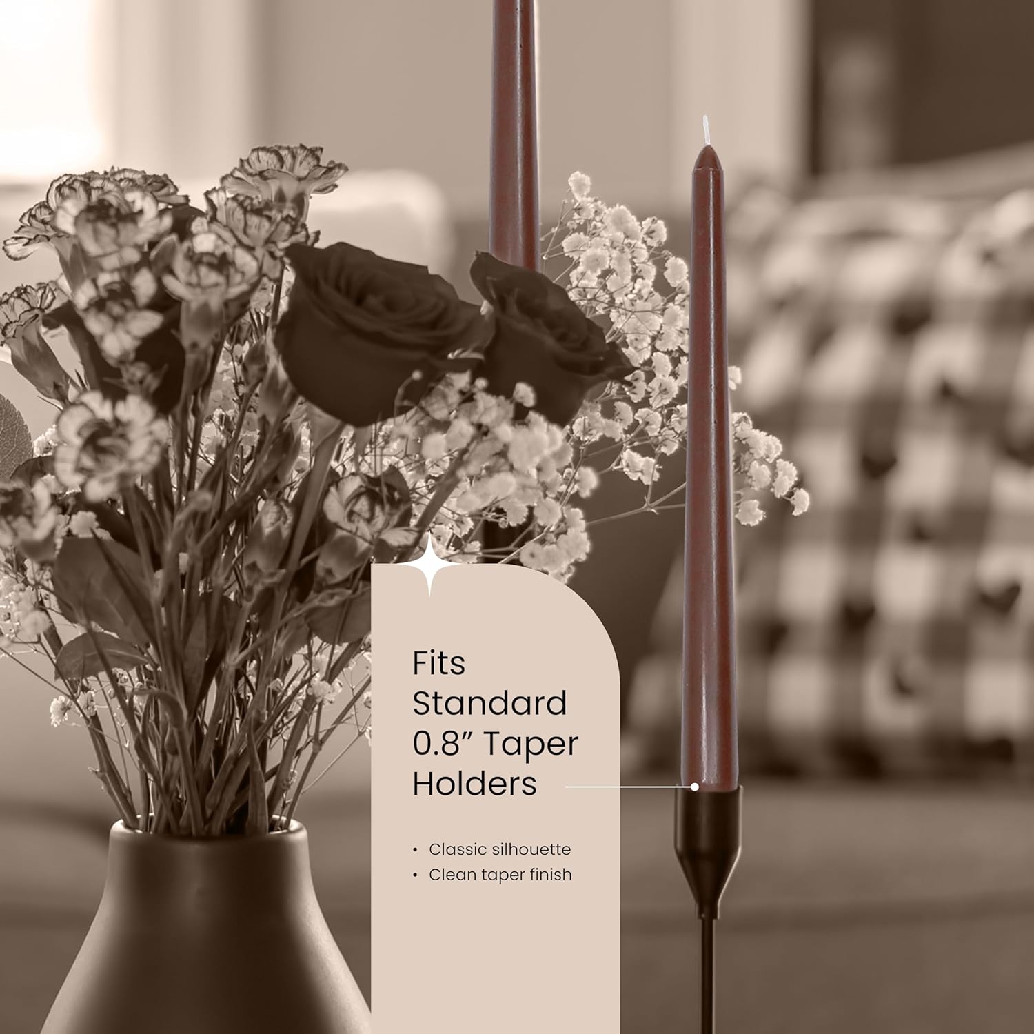 • Long-Burning Brown Tapered Candles – Each 10” taper burns up to 6 hours of fragrance-free light, ideal for rustic autumn dinners, Thanksgiving feasts, or farmhouse décor where earthy candlesticks add cozy charm.