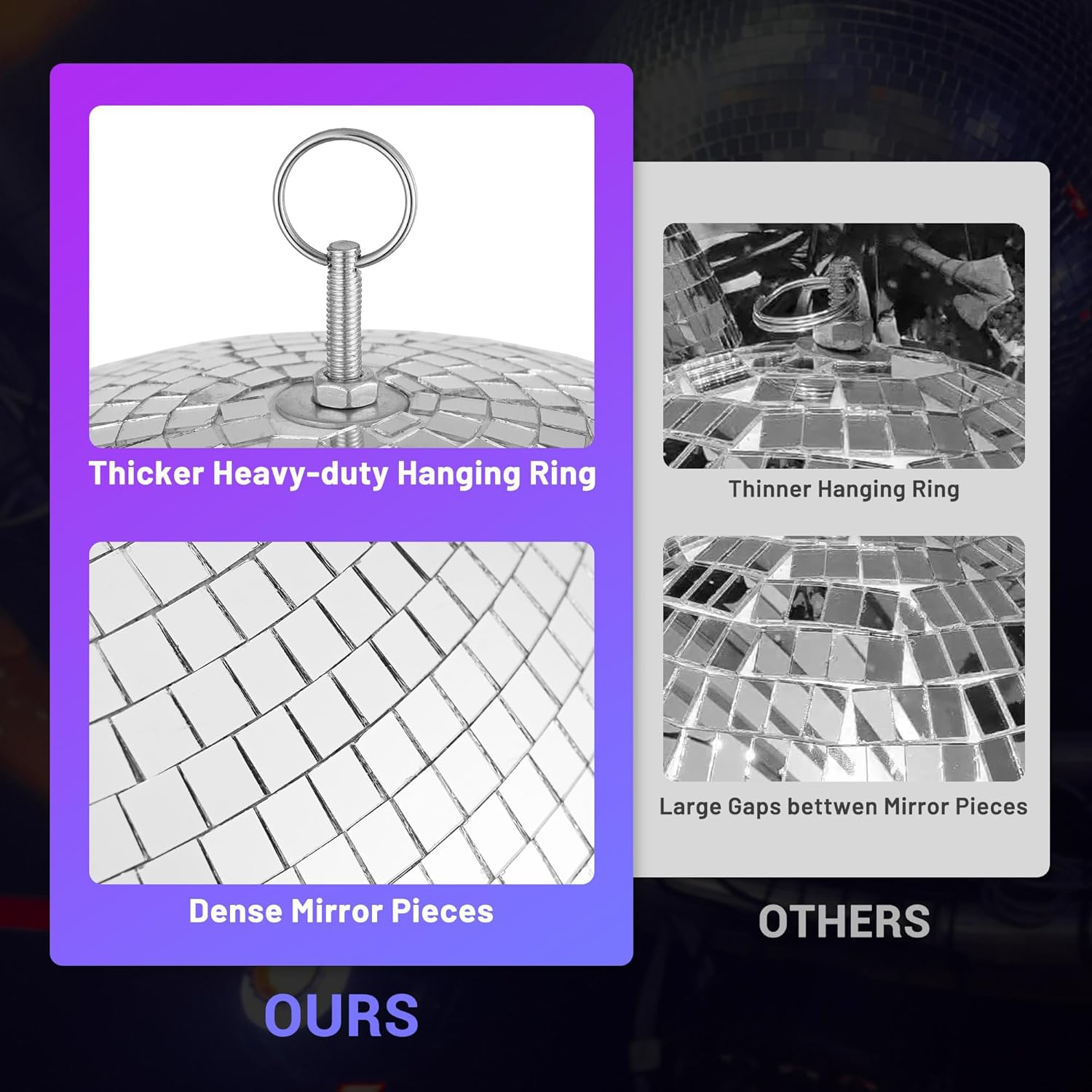 • Easy Installation - No assembly required, with a built-in hanging ring that easily attaches to a rotating motor, or place the mirror ball on the floor or anywhere you like for decoration