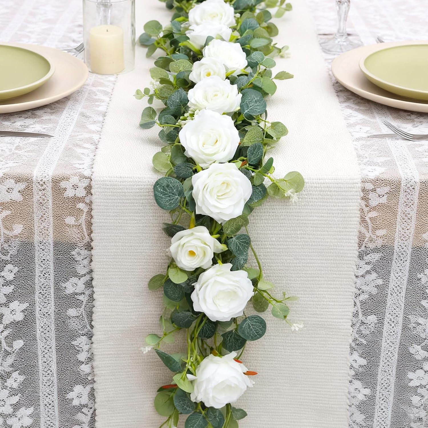 6FT Artificial Eucalyptus Garland with 14 Fake White Rose Flowers - Floral Greenery Decoration Vine for Wedding Centerpieces, Table Runner, Backdrop, Arch Wall Decor,Indoor/Outdoor (2 PCS)