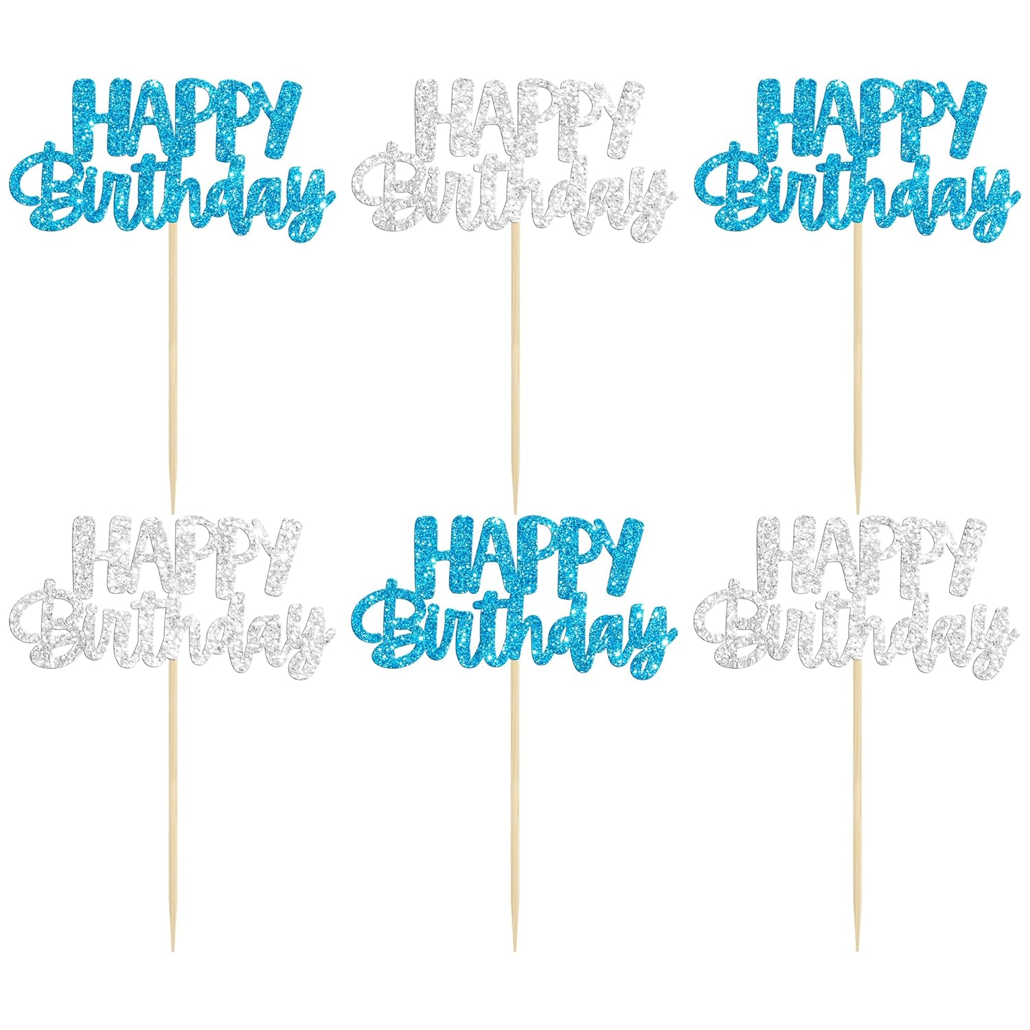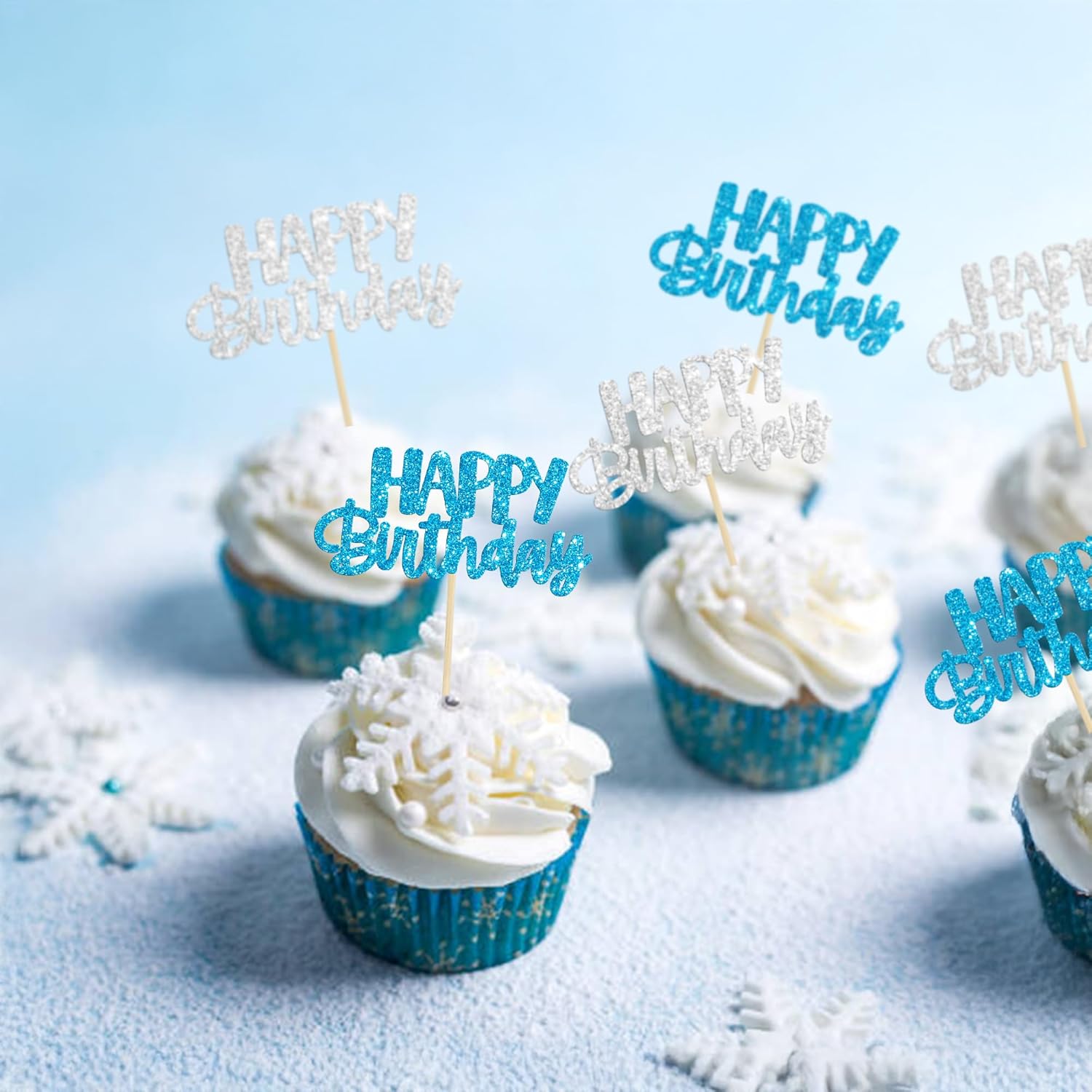 Gyufise 24Pcs Happy Birthday Cupcake Toppers Glitter Birthday Cupcake Food Picks for Celebrating Winter Wonderland Theme Party Cake Decorations Supplies Blue Silver