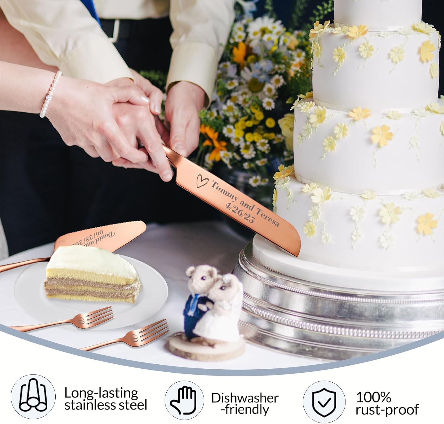 Personalized Wedding Cake Knife and Server Set, Custom Names Cake Cutting Set with Stainless Steel Forks, Customized Bridal Anniversary Birthday Wedding Registry Gifts for Couple (Rose Gold)