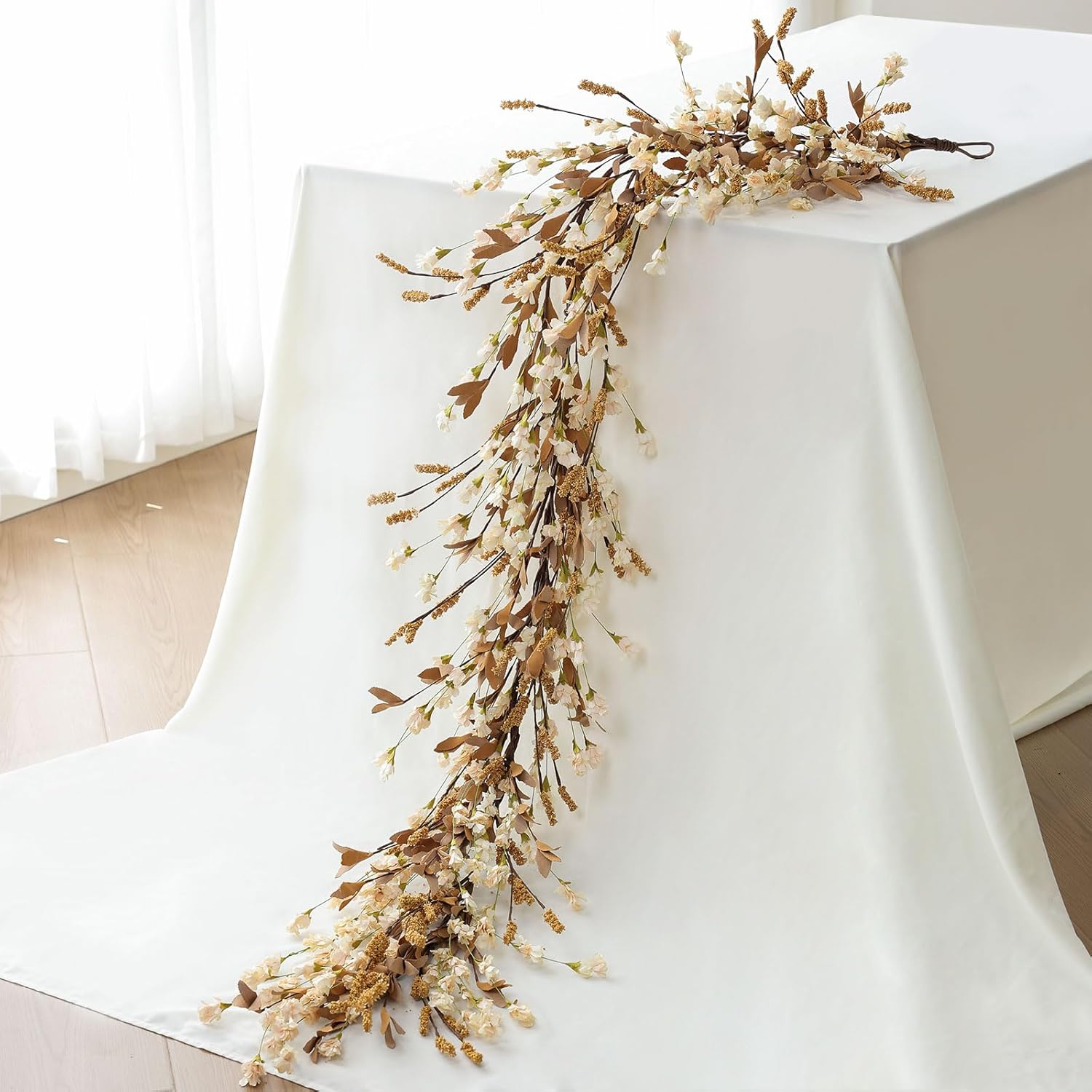 Mizii Fall Garland Artificial Flower Garlands 6 Feet Fake Wildflower Floral Garland Hanging Vines Flowers Decorations for Mantle Table Centerpieces Room Wall Fireplace Wedding Fall Decor (Beige)