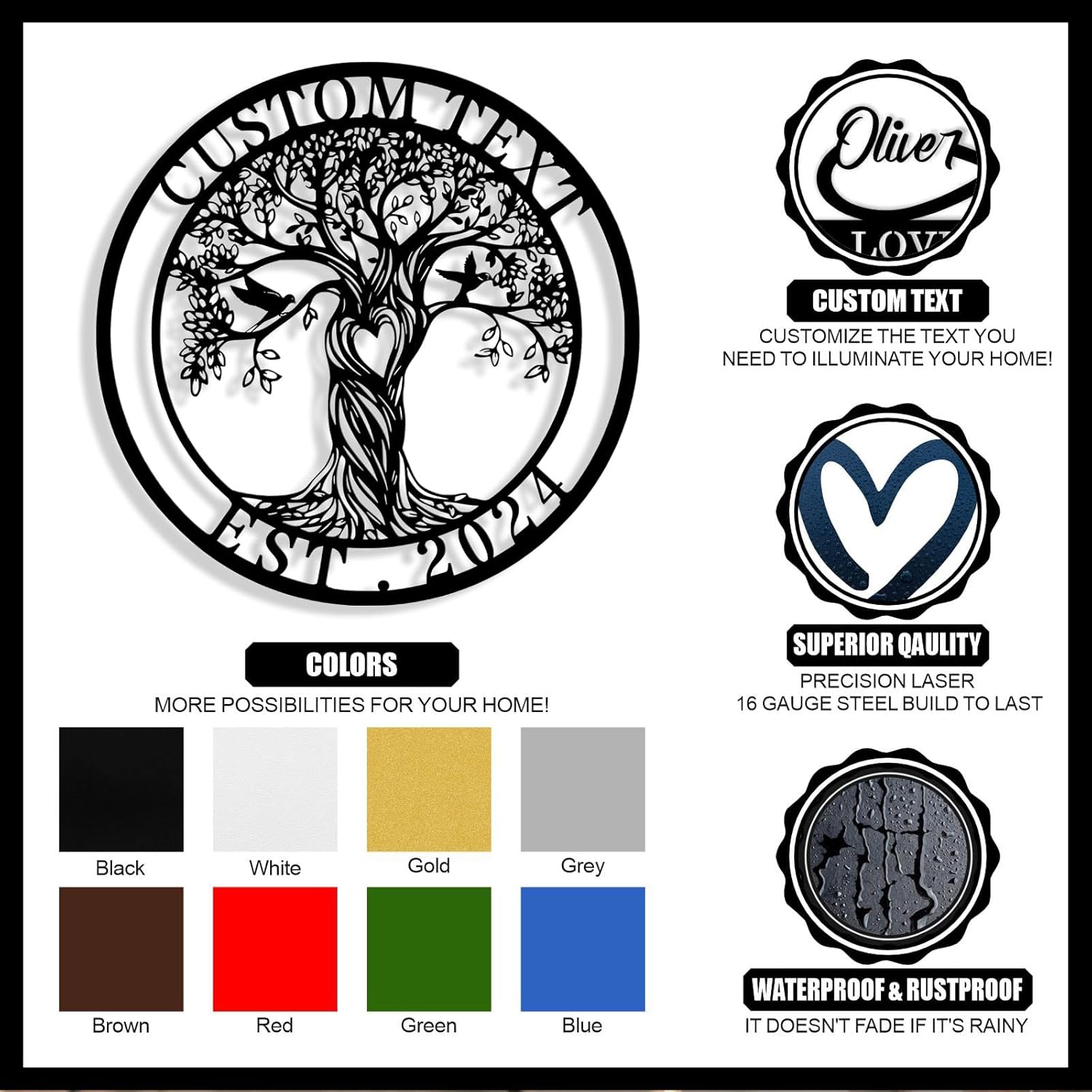 • Sturdy Material -- Our custom tree of life metal sign is crafted from sturdy 16 gauge steel with unique laser technology. The custom signs are powder coat finished. The surface is smooth, free of burrs, waterproof, anti-fading, can keep it use for years.
