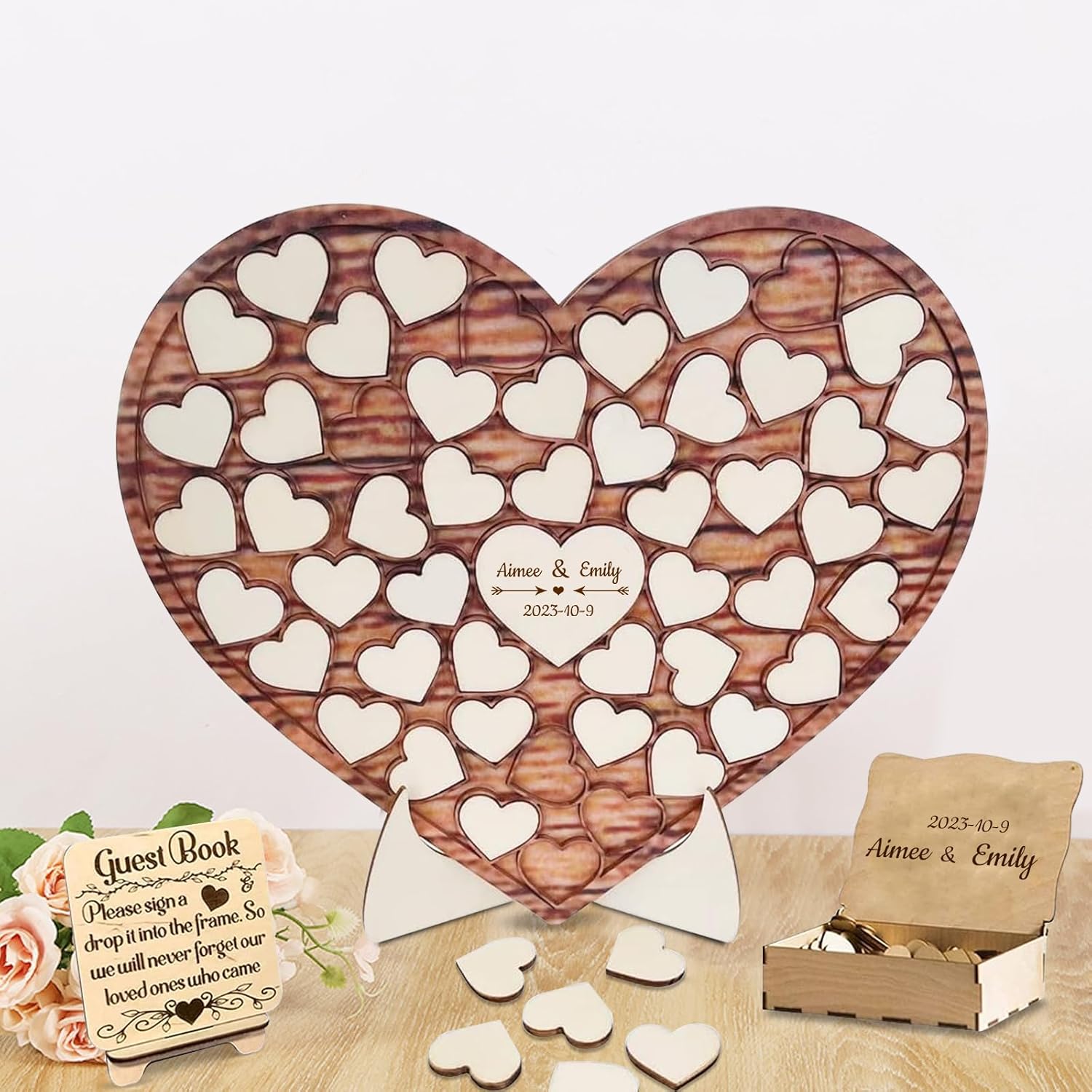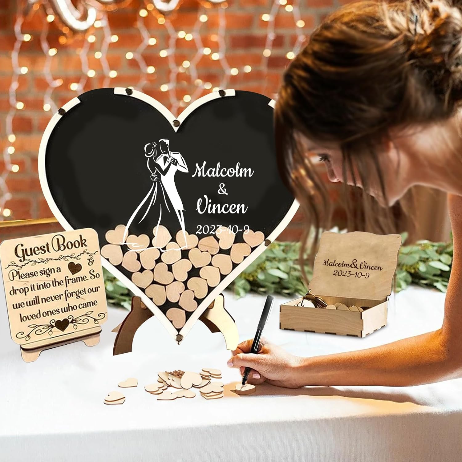 • Personalized Wedding Guest Book: This customizable wedding guest book allows for personalized names and dates. The couple can have their names and wedding date engraved on the book, transforming it into a special wedding keepsake. Guests write their names or well-wishes on heart-shaped wooden pieces before placing them inside the book. Each wooden piece carries the guest's heartfelt message, capturing a special moment from the couple's wedding day.
