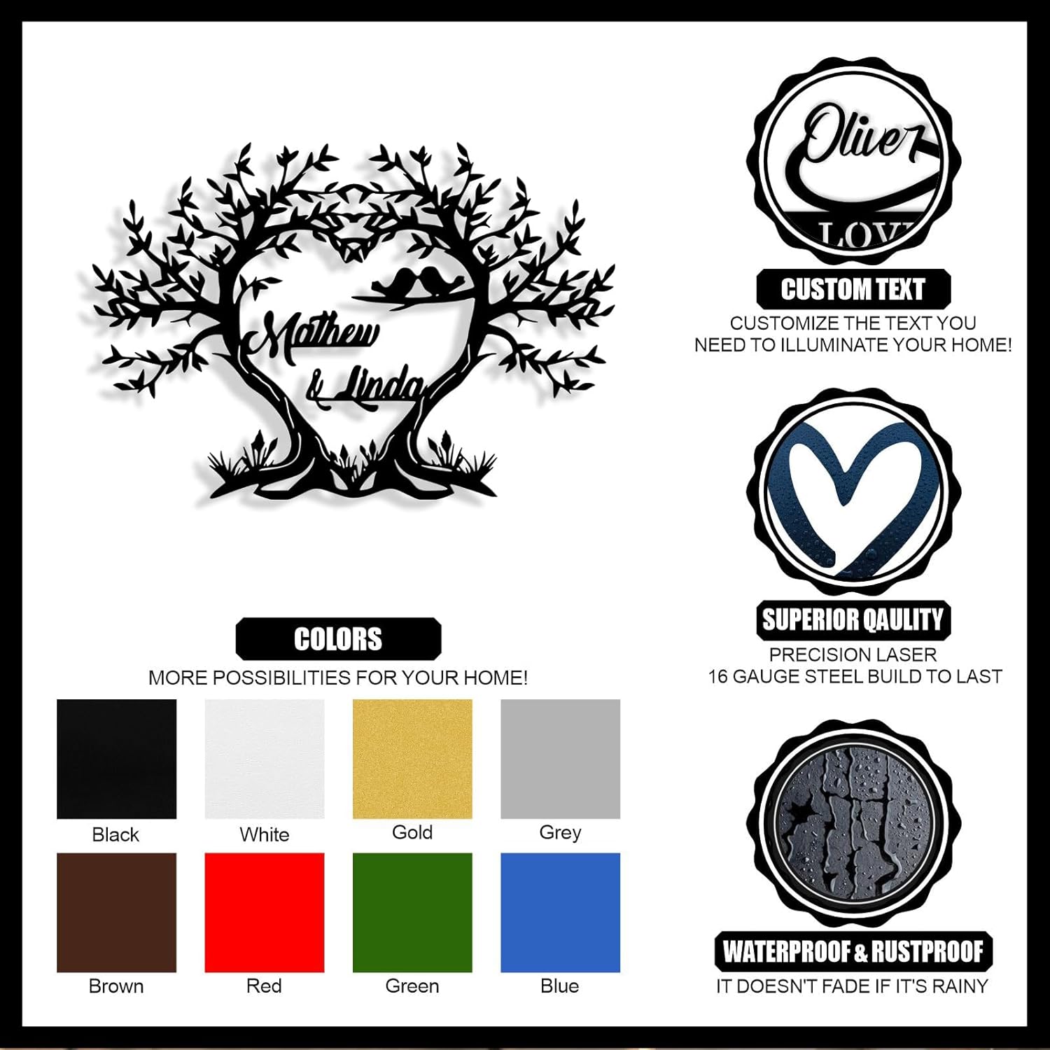 • Sturdy Material -- Our custom tree of life metal sign is crafted from sturdy 16 gauge steel with unique laser technology. The custom signs are powder coat finished. The surface is smooth, free of burrs, waterproof, anti-fading, can keep it use for years.