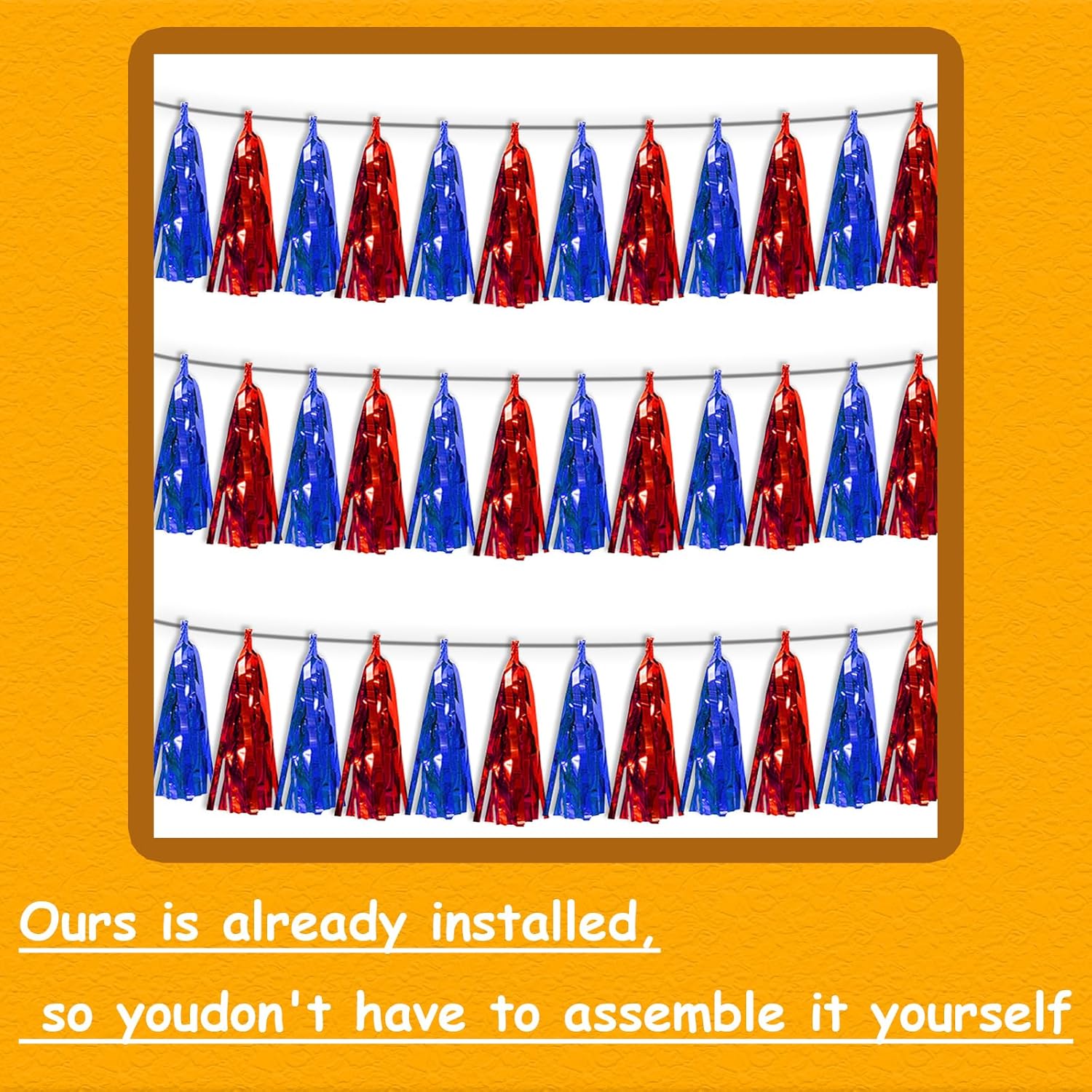 • 【Package Includes】The total length of the blue red birthday tassels banner is 30 feet, divided into 3 strips, each 10 feet long. Each banner contains 15 tassels, and each tassel measures 14 inches, for birthday decorations many occasions uitable for Patriotic display, Homecoming Float, Christmas Float, ecorative metal trailers, graduation floats etc