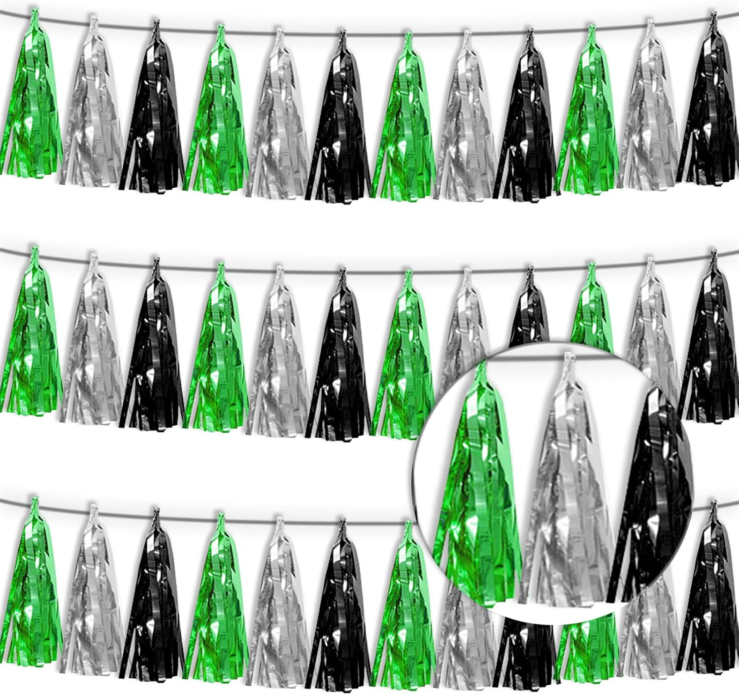 3P Black Silver Green Metallic Fringe Tassel Banner Garland Foil Tinsel Streamer Wall Hanging Curtain Backdrop Banner for Parade Floats, Graduation Decorations, Halloween, Christmas Decorations