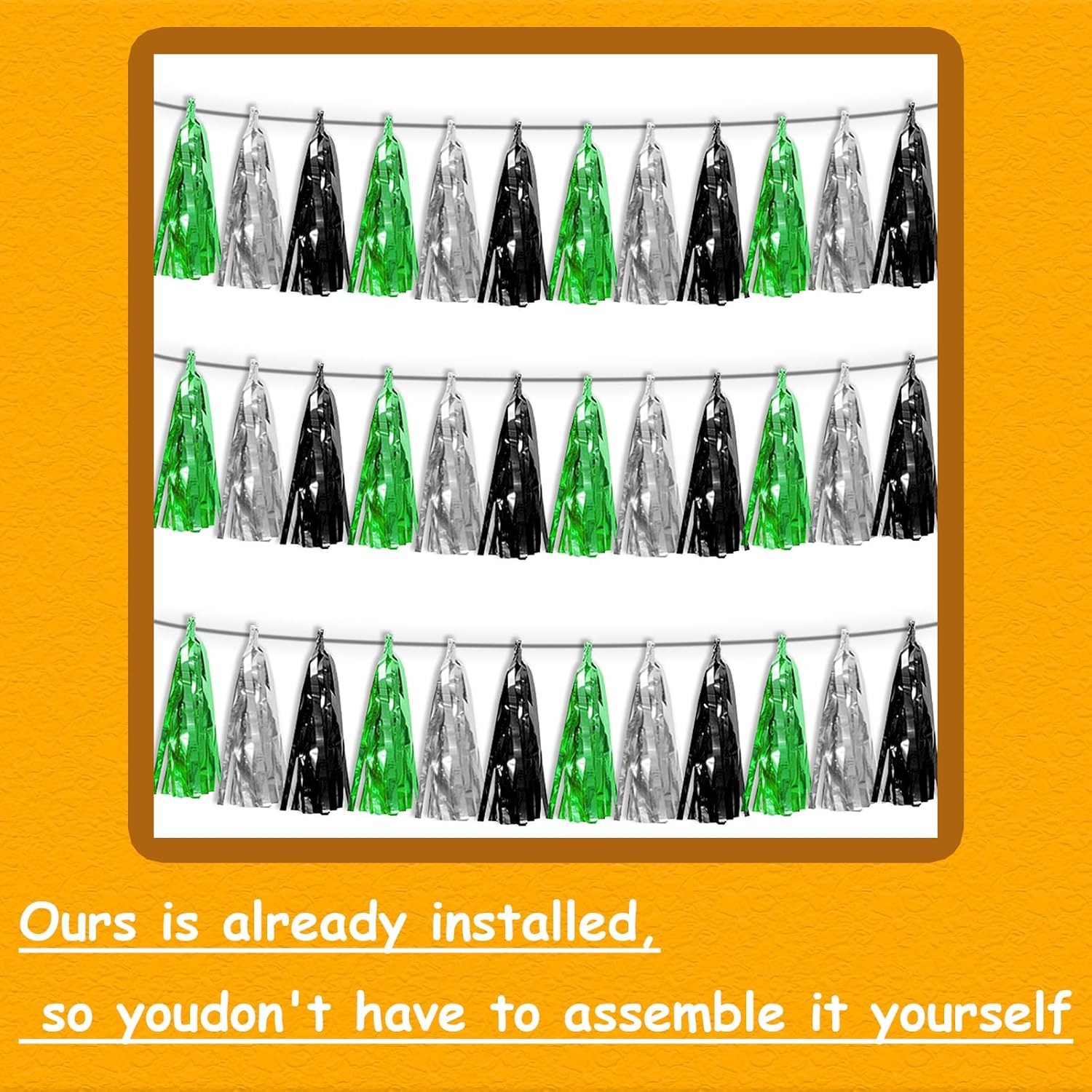 • 【Package Includes】The total length of them Black Silver Green birthday tassels banner is 30 feet, divided into 3 strips, each 10 feet long. Each banner contains 15 tassels, and each tassel measures 14 inches, for birthday decorations many occasions uitable for Patriotic display, Homecoming Float, Christmas Float, ecorative metal trailers, graduation floats etc