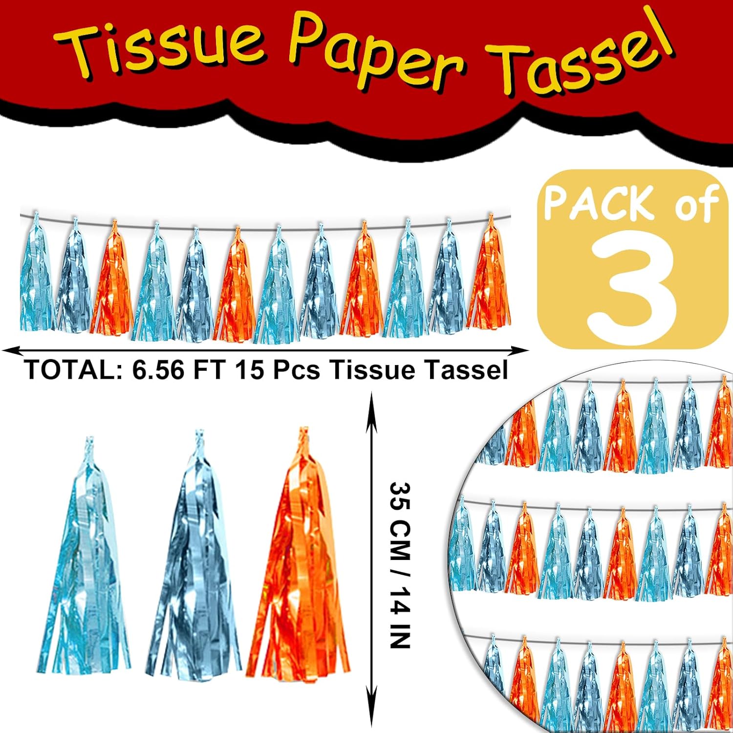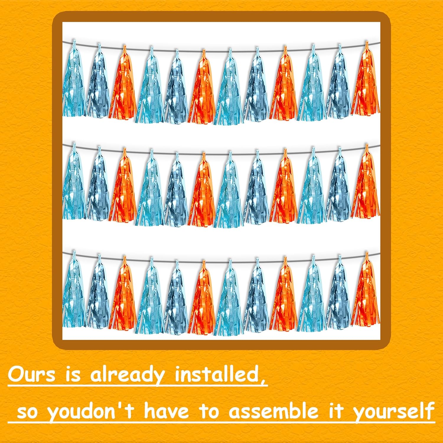 • 【Package Includes】The total length of the Lake Blue Light Blue Orange birthday tassels banner is 30 feet, divided into 3 strips, each 10 feet long. Each banner contains 15 tassels, and each tassel measures 14 inches, for birthday decorations many occasions uitable for Patriotic display, Homecoming Float, Christmas Float, ecorative metal trailers, graduation floats etc
