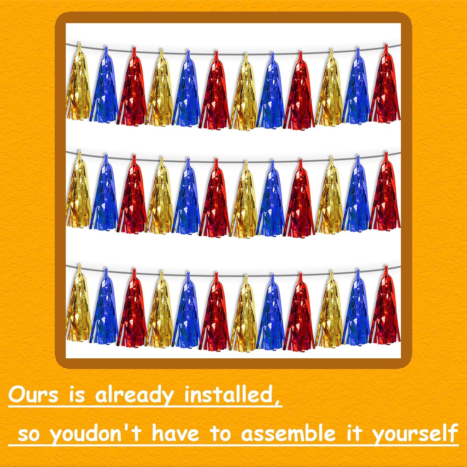 • 【Package Includes】The total length of the Gold Blue Red birthday tassels banner is 30 feet, divided into 3 strips, each 10 feet long. Each banner contains 15 tassels, and each tassel measures 14 inches, for birthday decorations many occasions uitable for Patriotic display, omecoming Float, Christmas Float, ecorative metal trailers, graduation floats etc