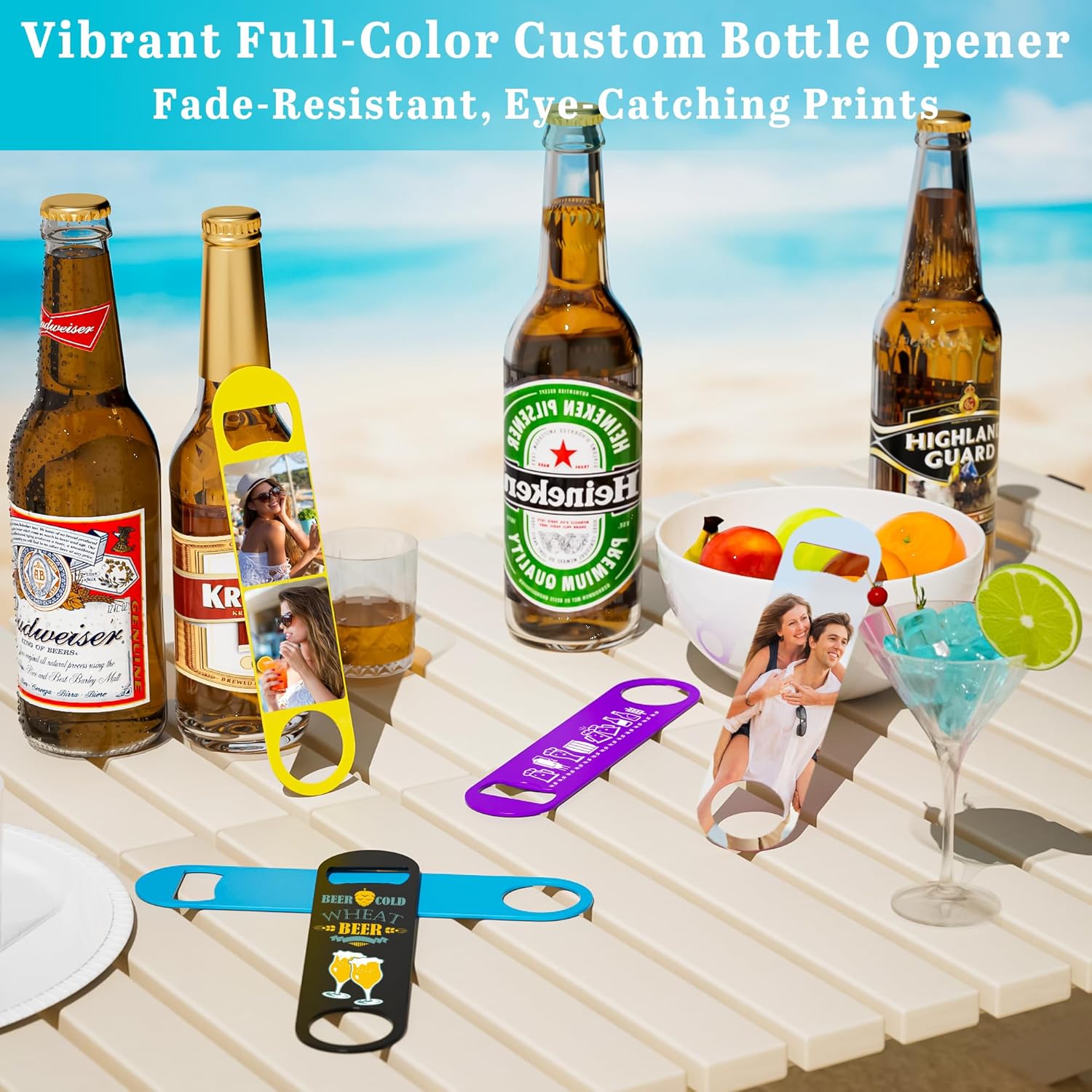 • Full-Size Customization for Branding & Personalization: This customizable bottle opener comes with vibrant double-sided full-color UV printing that are clear and durable. Add logos, text, photos, etc. Choose 7 base colors (white, Black, Purple, Blue, Yellow, Pink, Silver) for brand/event/style, ideal as unique keepsakes or promo items