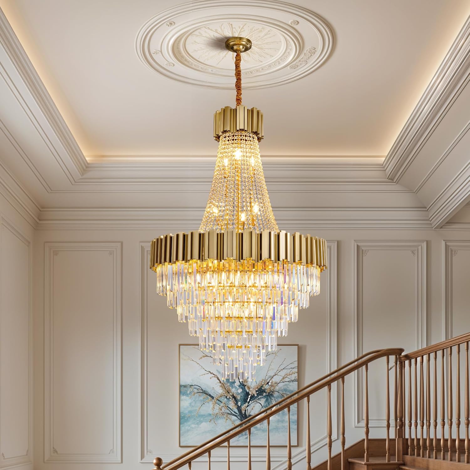 • 【Luxury High Ceiling Chandelier】This stunning modern chandelier is crafted with premium gold frame and 100% top K9 transparent crystals that exude a diamond-like brilliance. With 420 sparkling crystals adds brilliance and sophistication, each crystal refracts light beautifully, creating a dazzling, luxurious atmosphere for your home.