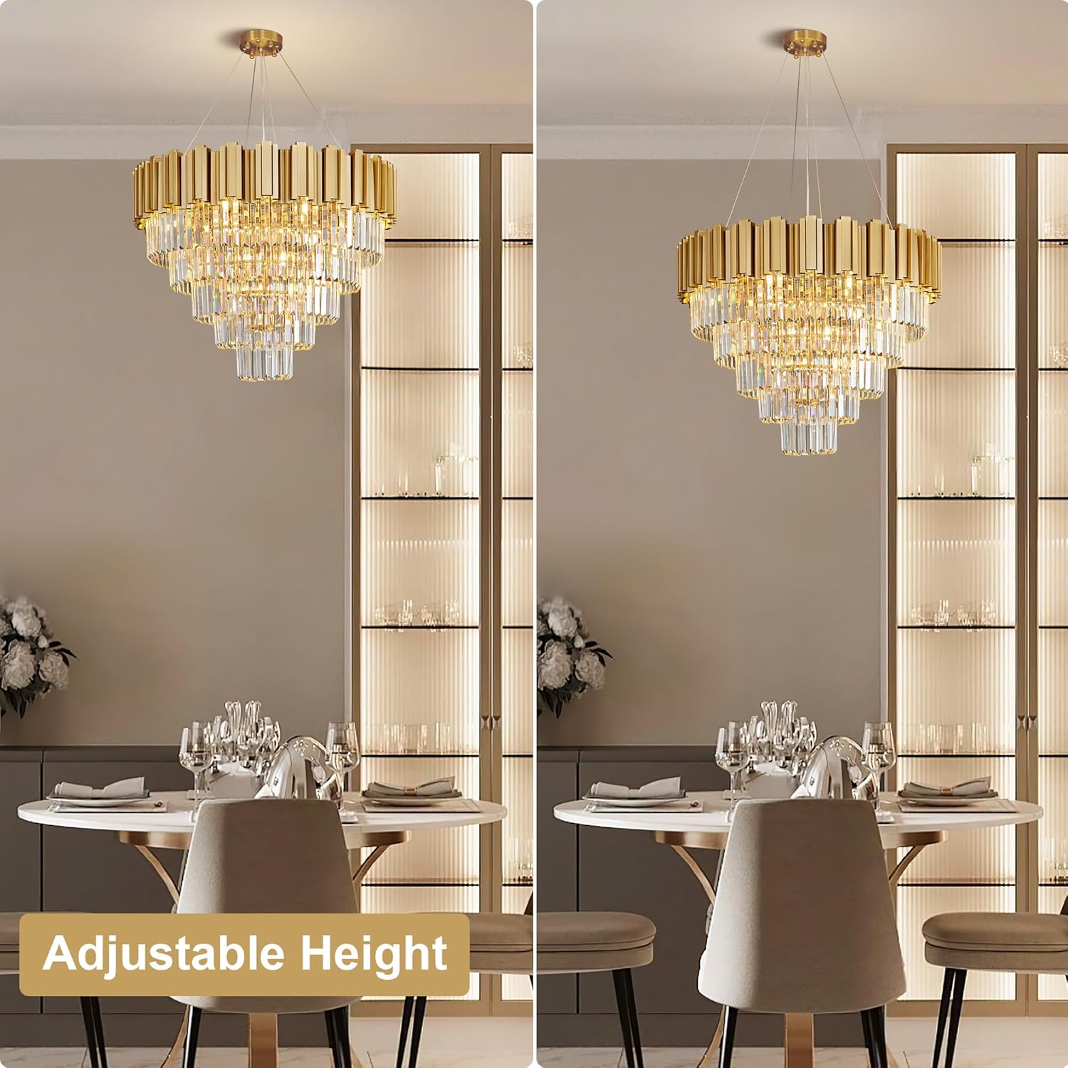 • 【Luxury Crystal Chandelier】This modern chandelier is crafted with premium gold frame and 100% top K9 transparent crystals that exude a diamond-like brilliance. With 5 tiers and 228 sparkling crystals adds brilliance and sophistication, each crystal refracts light beautifully, creating a dazzling, luxurious atmosphere for your home.