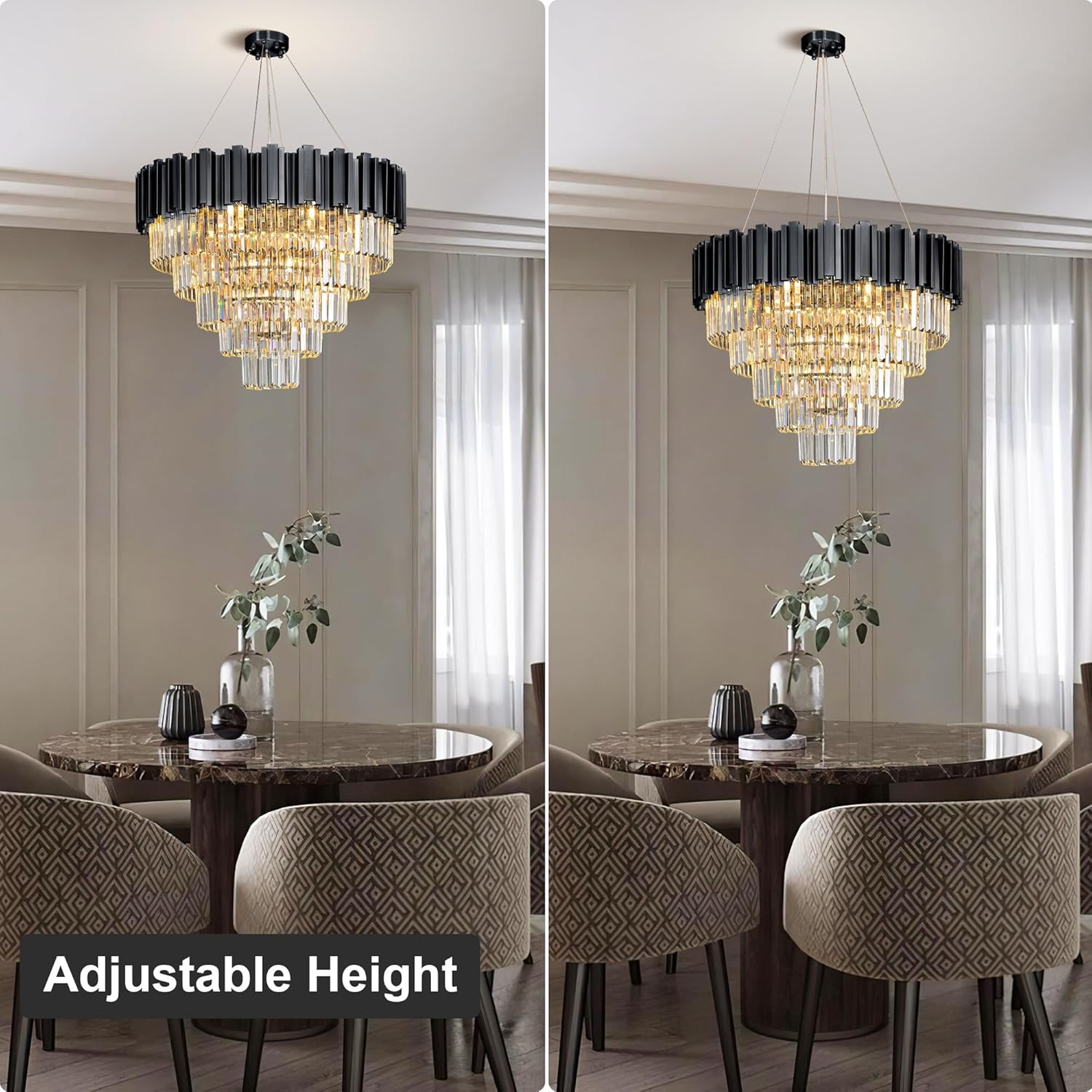• 【Luxury Crystal Chandelier】This modern chandelier is crafted with premium matte black frame and 100% top K9 transparent crystals that exude a diamond-like brilliance. With 5 tiers and 228 sparkling crystals adds brilliance and sophistication, each crystal refracts light beautifully, creating a dazzling, luxurious atmosphere for your home.