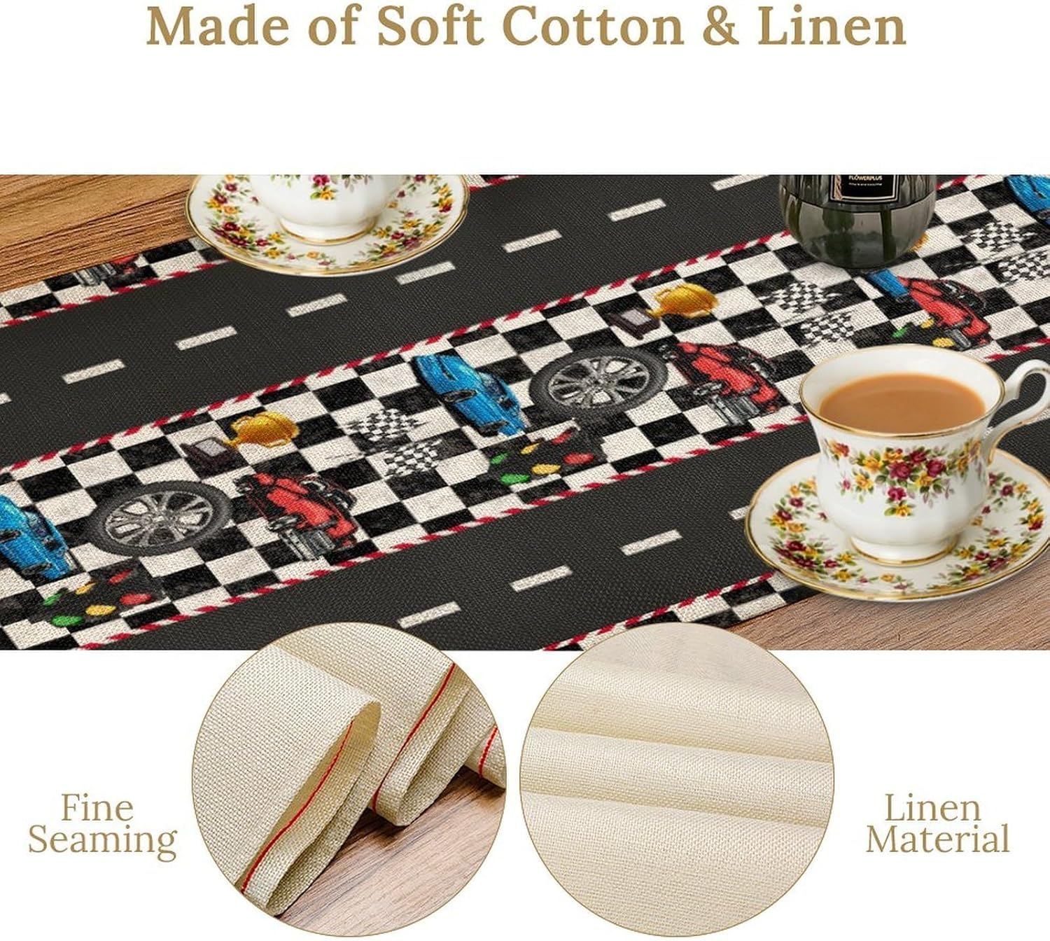 Race Car Table Runner,Checkered Flag Black and White Race Cars Pattern Print Tablecloth Burlap for Hotel Indoors Outdoor Dining Room Kitchen Home Decor,W13X L80 in