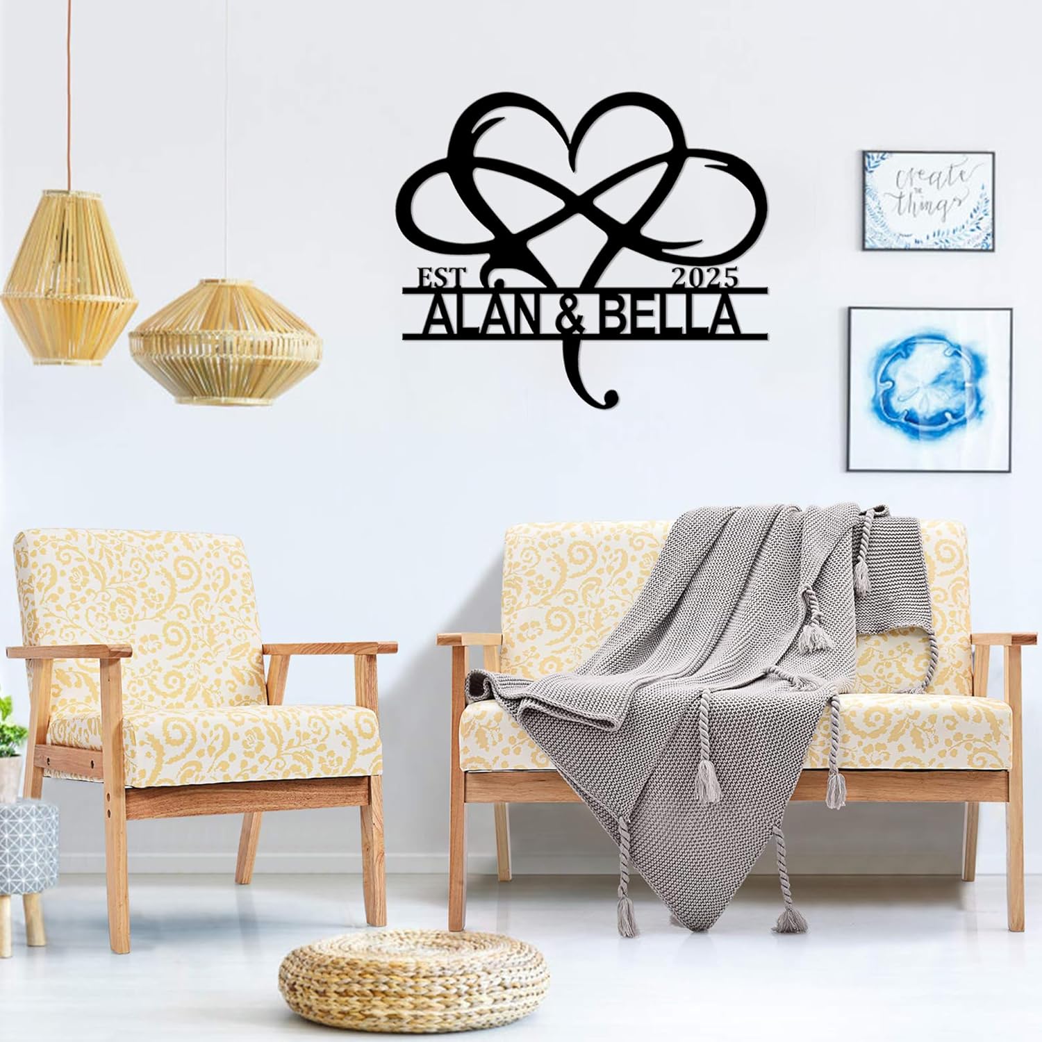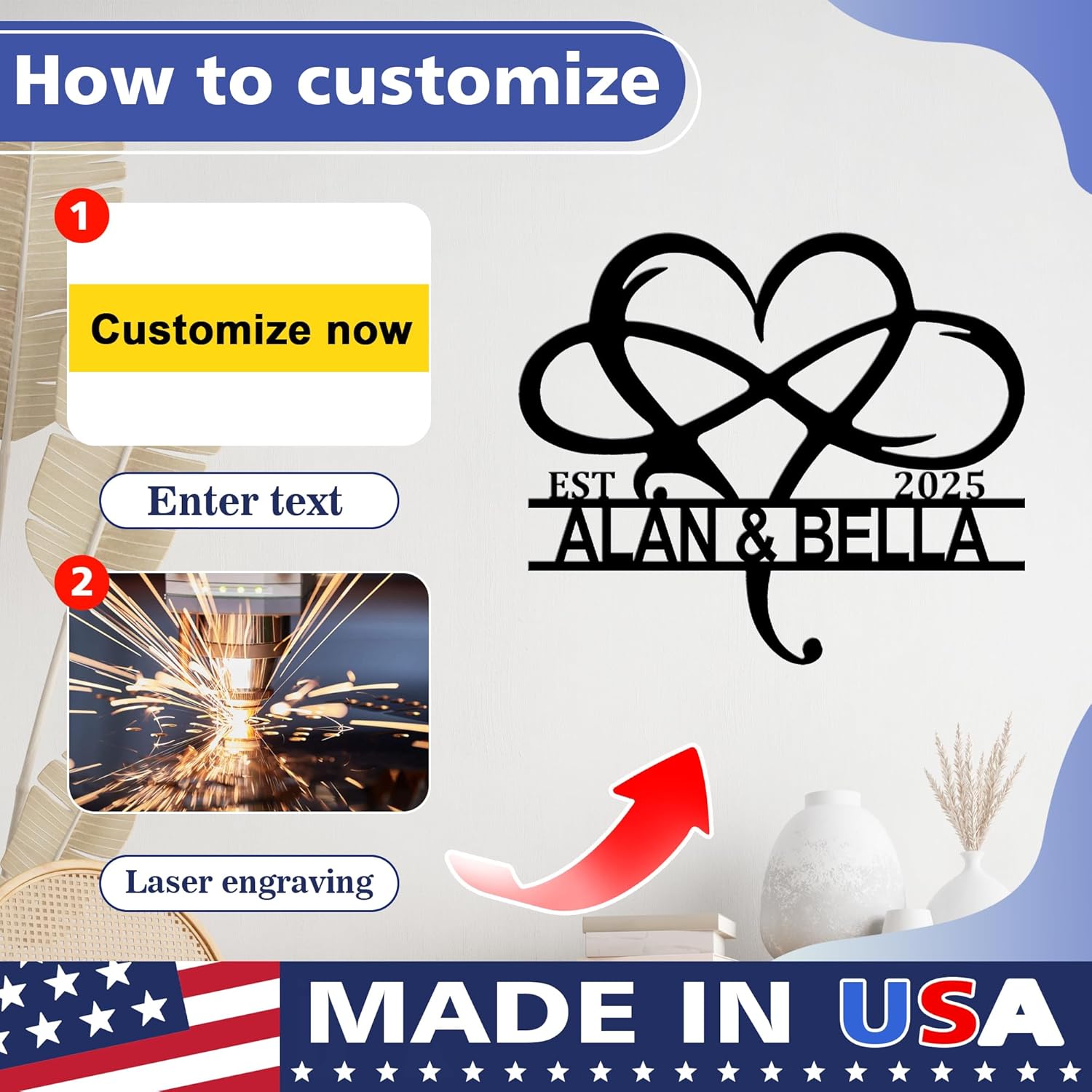 • CUSTOM MONOGRAM METAL SIGNS: Our metal signs are made in the USA, ship quickly. We offer a variety of designs and sizes to choose from. You can customize your name, last name, and anniversary date as a home decor sign, living room wall decor sign, or wedding sign. It is not only the perfect home decoration, but also an excellent way to showcase beautiful memories.